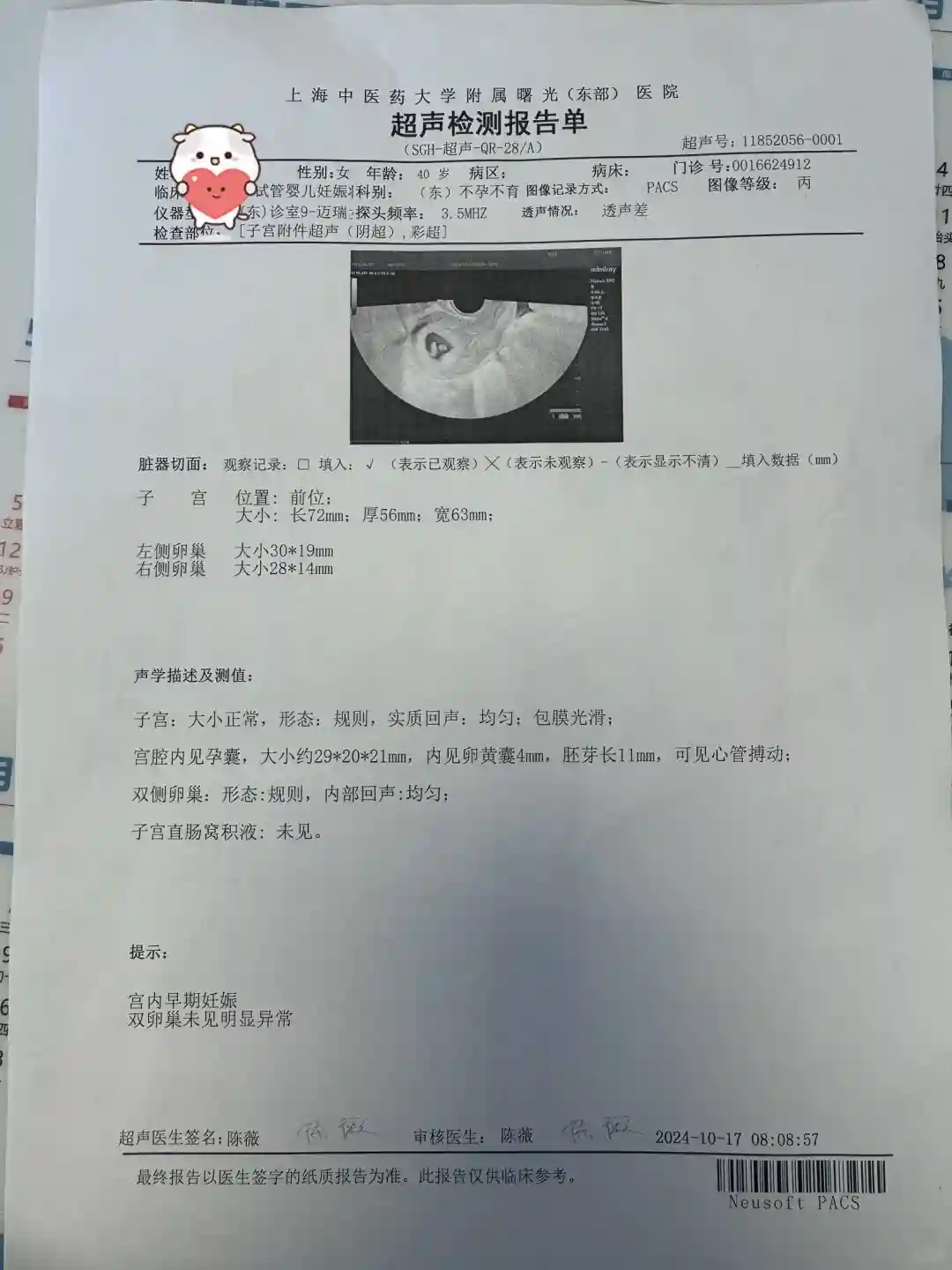 这个姑娘就是之前提到的糊涂仙,今年40岁,史上最糊涂没有之一,一超已经顺利通过了。她怀孕了才告诉我,她连自己做的一代都不知道,是不是囊胚,甚至移植了几个胚胎她都不知道去社区建卡,医生想了解她的情况就直接甩给人家她的病历本说,你们看吧我的主治医生都写在上面了估计社区医生也要懵,大概头一次碰到高龄试管有合并症,心还这么大的孕妇。虽然她有点夸张,但是大家还是要学习她的心态,怀孕的事情上要傻一点,放宽心