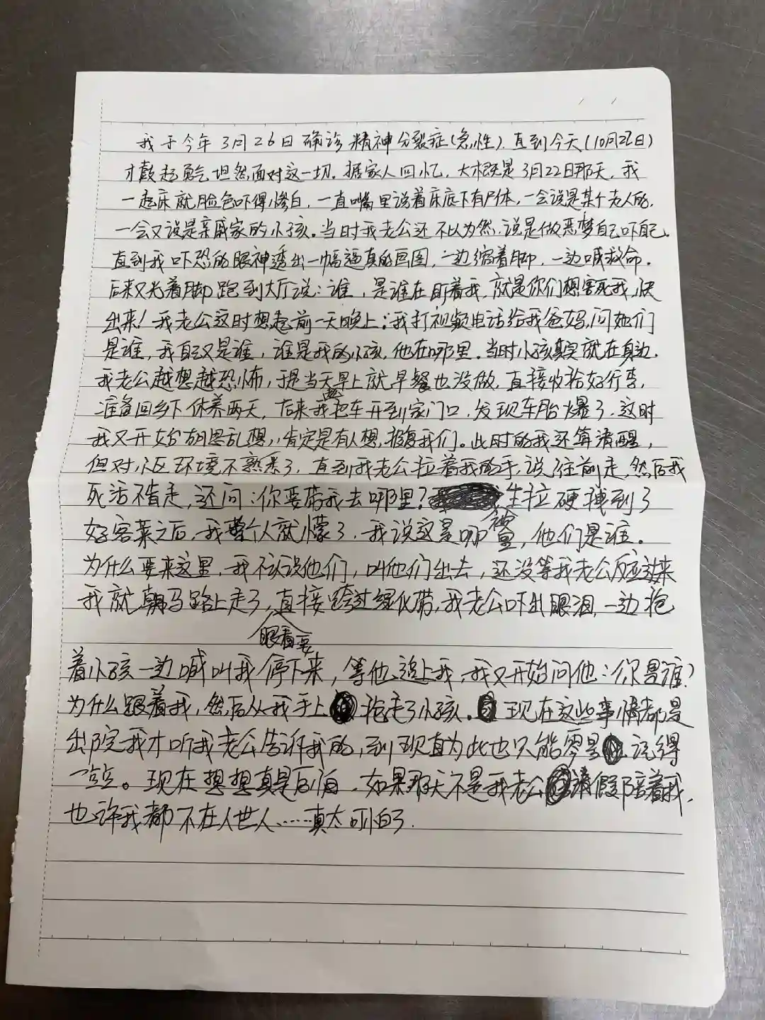 我于今年3月26日确诊精神分裂症(急性),直到今天(10月22日)才鼓起勇气坦然面对这一切。据家人回忆,大概是3月22日那天,我一起床就脸色吓得惨白,一直嘴里说着床底下有具尸体,一会说是某个老人的,一会又说是亲戚家的小孩。当时我老公还不以为然,说是做恶梦自己吓自己。直到我惊恐的眼神透出一幅逼真的画面:一边缩着脚,一边喊救命。后来又光着脚跑到大厅说:谁,是谁在盯着我,就是你们想害死我,快出来!突然这时我老公联想起前一天晚上的事:我打视频电话给我爸妈,问她们是谁?我自己是谁?谁是我的小孩?他在哪里?当时小孩其实就在身边。我老公越想越恐怖,于是当天早上就早餐也没做,直接收拾好行李,准备回乡下休养两天。后来我老公把车开到家门口,发现车胎爆了,这时我又开始胡思乱想,肯定是有人想报复我们。此时的我还算清醒,但对小环境不熟悉了,直到我老公拉着我的手,说往前走,然后我死活不肯走,还问:你要带我去哪里? 生拉硬拽到了好客莱之后,我整个人就懵了:我说这是哪懂,他们是谁。为什么要来这里,我不认识他们,叫他们出去,还没等我老公反立过来我就朝马路上走了,直接跨过绿化带,我老公吓下出眼泪直流,一边抱着小孩一边喊燕子叫我停下来,等他追上我,我又开始问他:你是谁?为什么跟着我,然后从我老公手上抢了小孩。一边哭,一边问,你们是谁,我不认识你们,甚至自己名字都不知道了,想要去哪里也不知道,就一边哭,一边漫无目的走着~~~现在这些事情都是出院后,我才逼我老公告诉我的,到现直为此也只能零星记得一点点。现在想想真是后伯,如果那天不是我老公请假陪着我,也许我都不在人世人……真太可怕#精神分裂症患者
