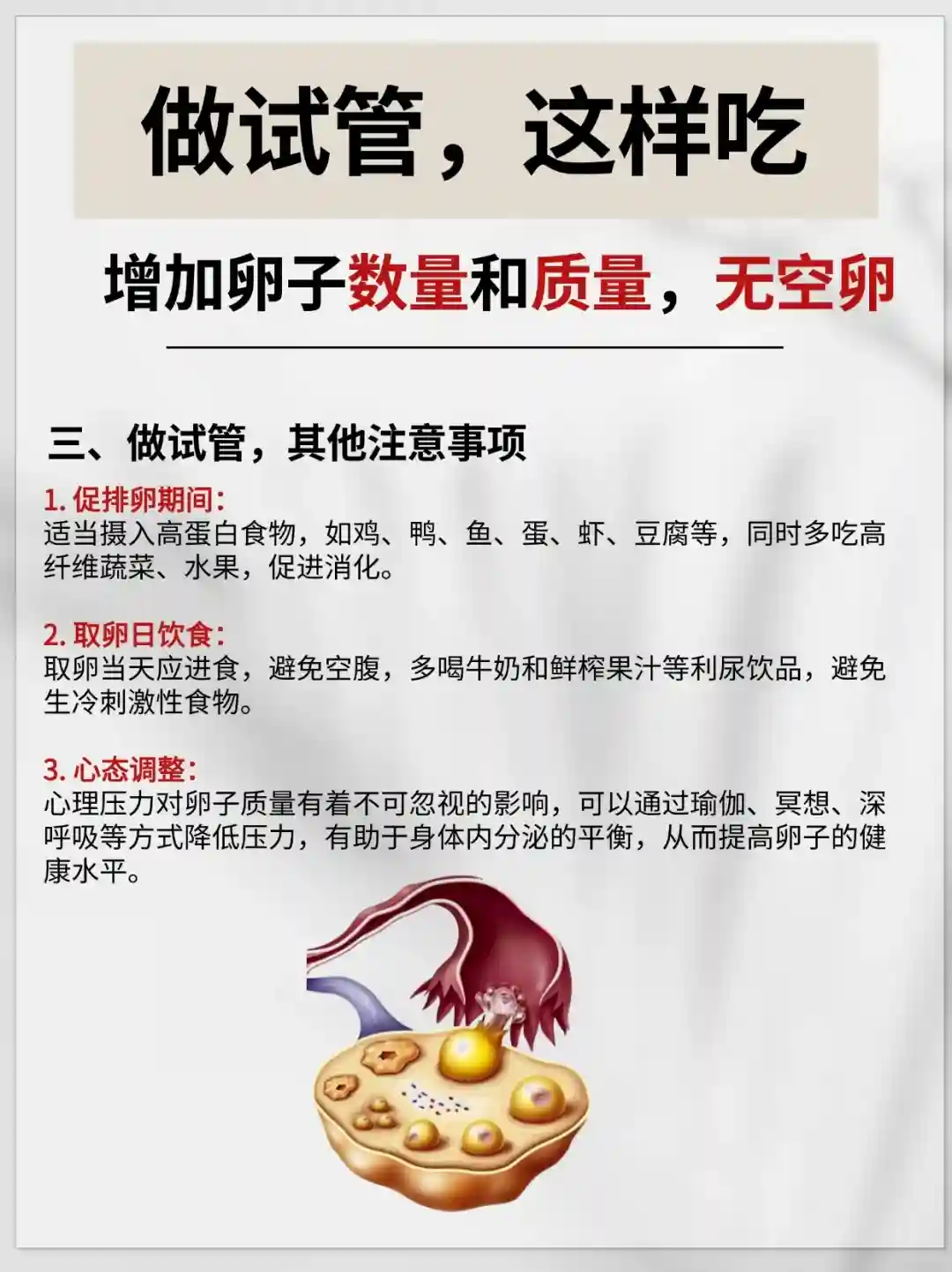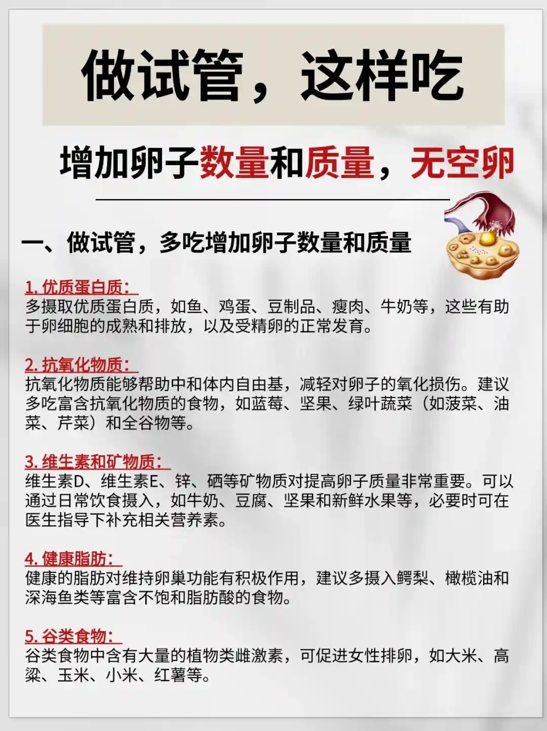 ‼️为了在做试管过程中增加卵子数量和质量,并减少空卵情况,在饮食上吃对是关键: