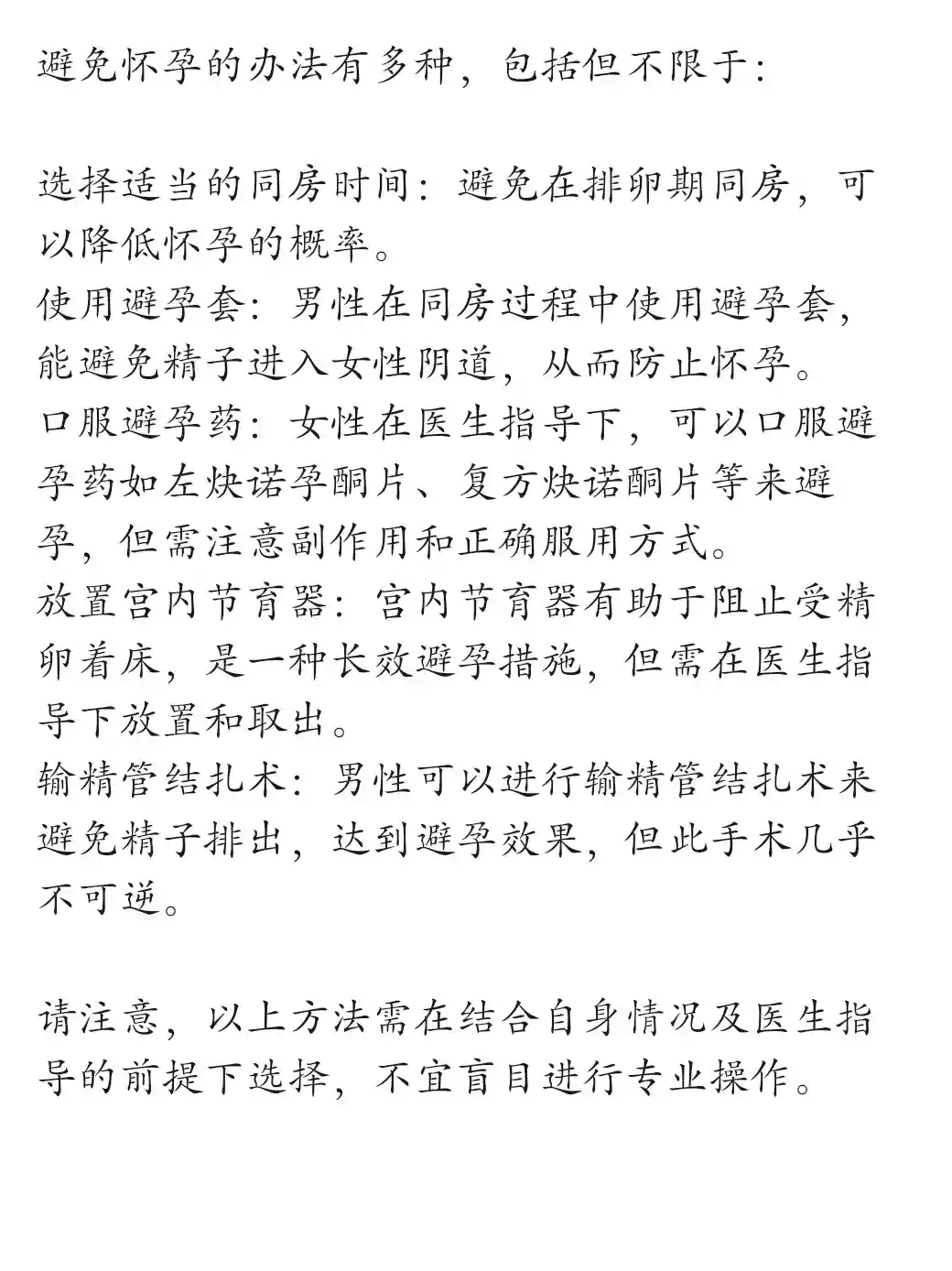 避免怀孕的办法有多种,包括但不限于: