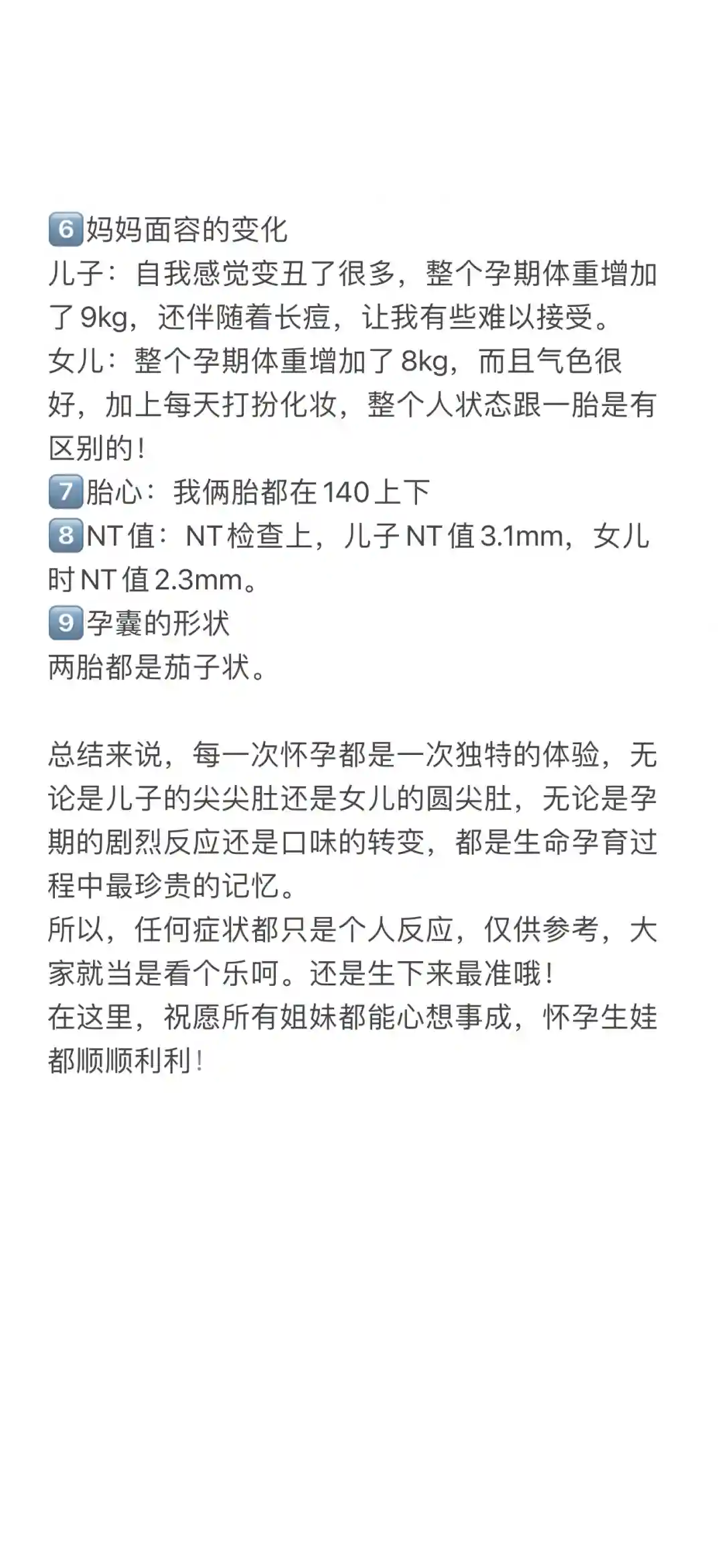 总结来说,每一次怀孕都是一次独特的体验,享受就好了。过程中每个人症状不同,仅供参考,大家就当是看个乐呵。还是生下来最准哦!