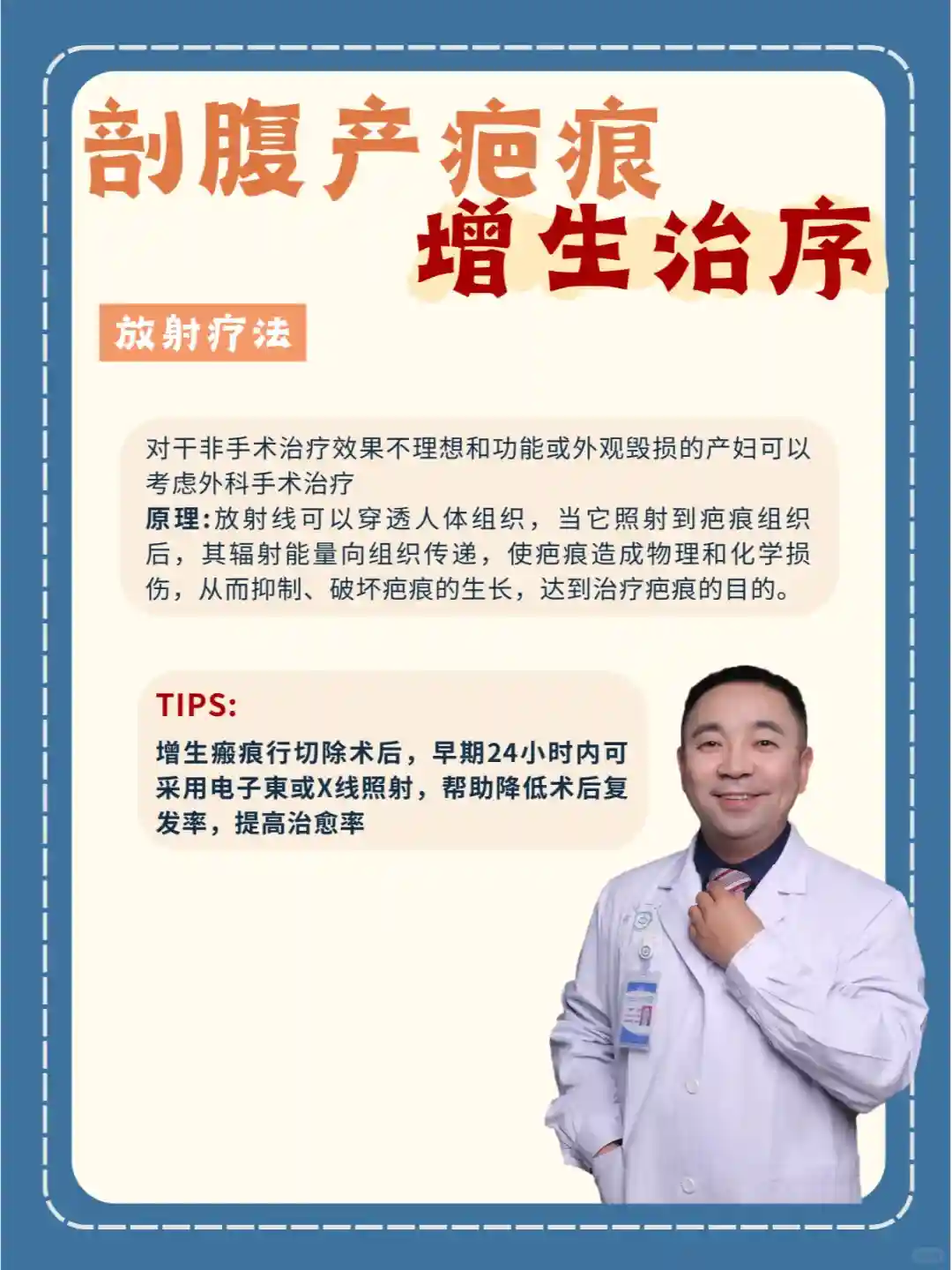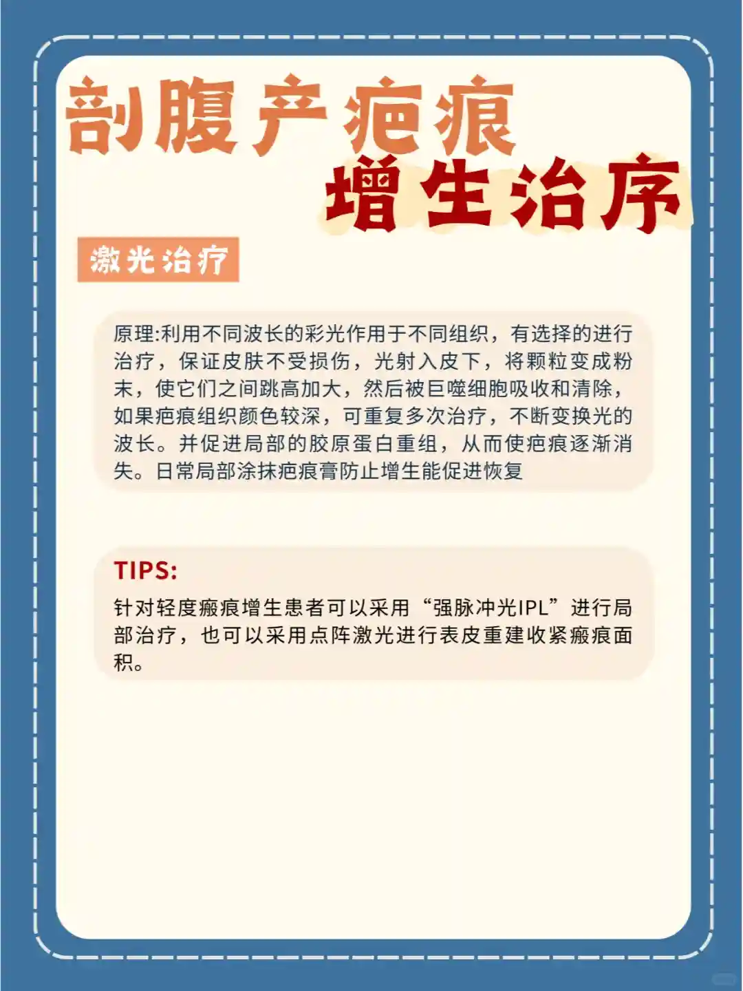 👉日常应做好腹部卫生,避免再次损伤,以及注意休息,保持良好心态,在术后初期做好伤口的护理工作。早期也可以通过光电的干预治疗,可以大大降低后期疤痕的治疗难度,甚至有些疤痕患者经过早期的干预治疗后,后期不需要再进行任何治疗。所以,对于疤痕的预防要远胜于治疗,宝妈一定要抓住这个最佳时期‼