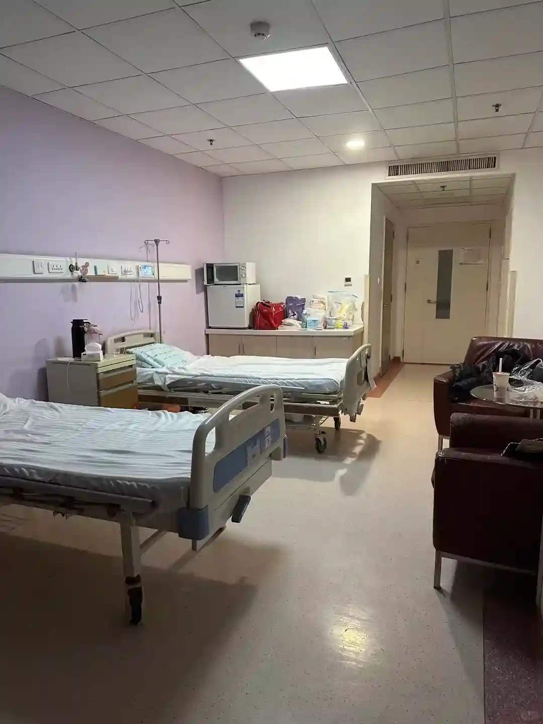 根据护士指引就可以上楼啦,保安会收陪护证,在闸门机刷陪护人员身份证,闸门即可打开~到入住楼层护士站办理入住,填写资料,量体重身高,签各种字,戴手环,发住院服,进房间后胎心监护+抽血+验尿,期间大夫来询问身体情况,签一堆字。提前跟主任要了单间(如图2),晚点护士来备皮(不疼,很痒),听胎心(不是胎监)~