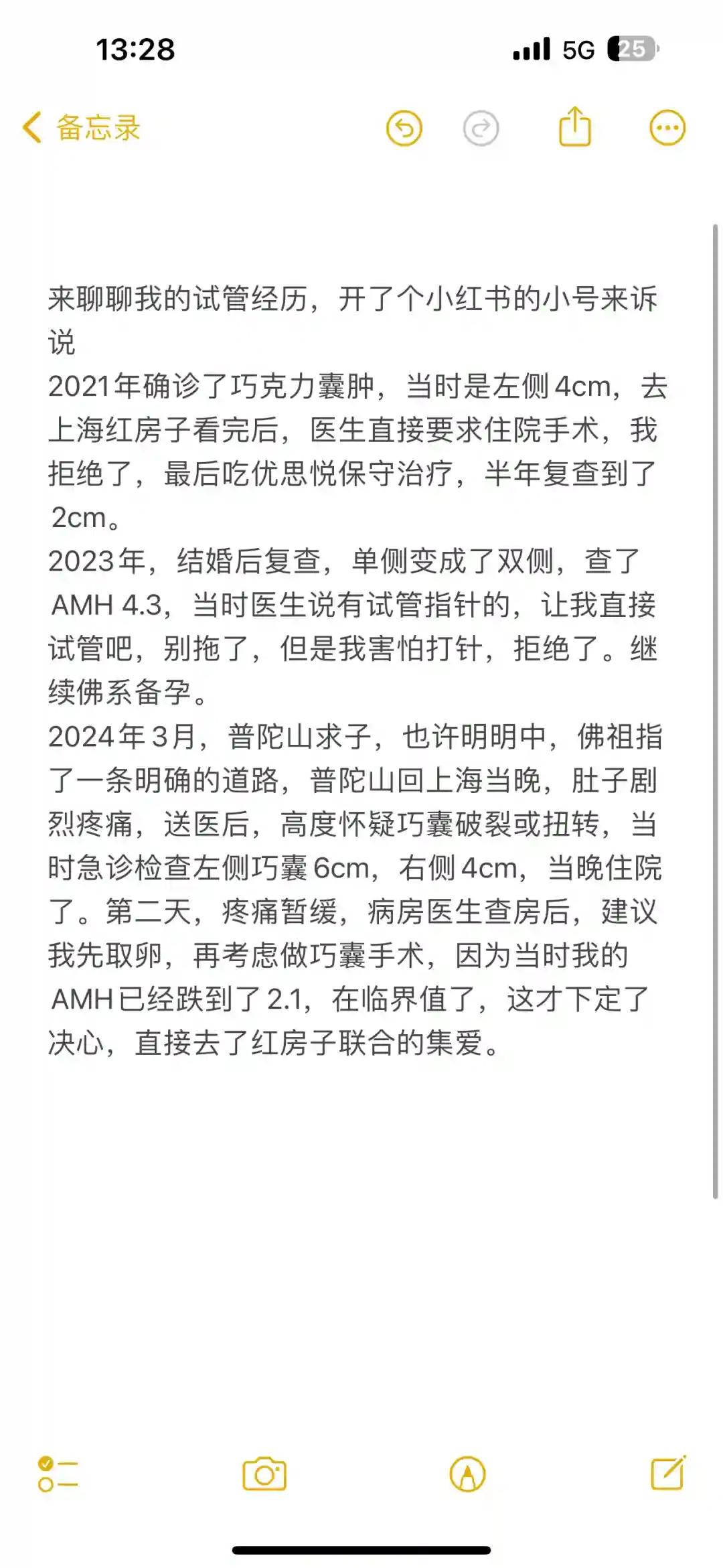 2024年3月,普陀山求子,也许明明中,佛祖指了一条明确的道路,普陀山回上海当晚,肚子剧烈疼痛,送医后,高度怀疑巧囊破裂或扭转,当时急诊检查左侧巧囊6cm,右侧4cm,当晚住院了。第二天,疼痛暂缓,病房医生查房后,建议我先取卵,再考虑做巧囊手术,因为当时我的AMH已经跌到了2.1,在临界值了,这才下定了决心,直接去了红房子联合的集爱。#备孕日记 #试管婴儿知识