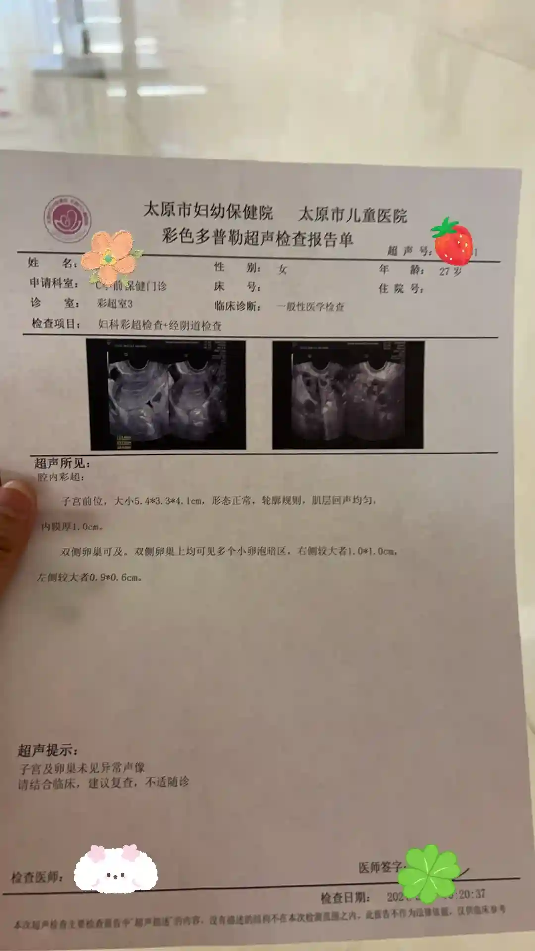 验尿,女性去查彩超,男性要查一下精Z的活跃度,听我老公说这个贼尴尬哈哈哈哈在这里不过多描述了,所以建议自己的老公做好心理准备哈哈哈哈!女性的彩超建议大家在例假结束10天以后查,可以查到卵子的大小和质量,如图6,全程放松就好,千万别紧张!