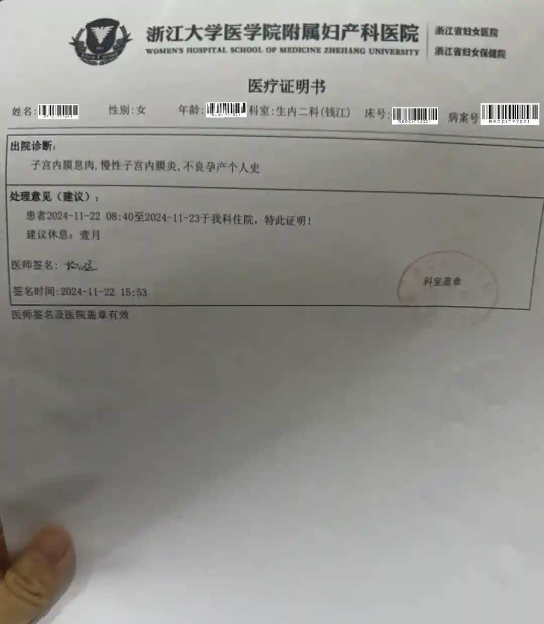 11.17 省妇保两个医生都是建议宫腔镜做掉。去杭州中医院,问了一直在看的中医,她也建议手术做掉。就回到省妇保的妇科门诊,让医生给我开了住院单,预约了11.22做手术。