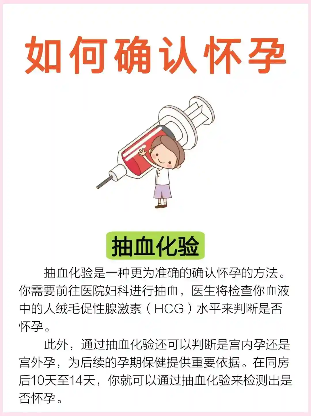 此外,通过抽血化验还可以判断是宫内孕还是宫外孕,为后续的孕期保健提供重要依据。在同房后10天至14天,你就可以通过抽血化验来检测出是否怀孕。