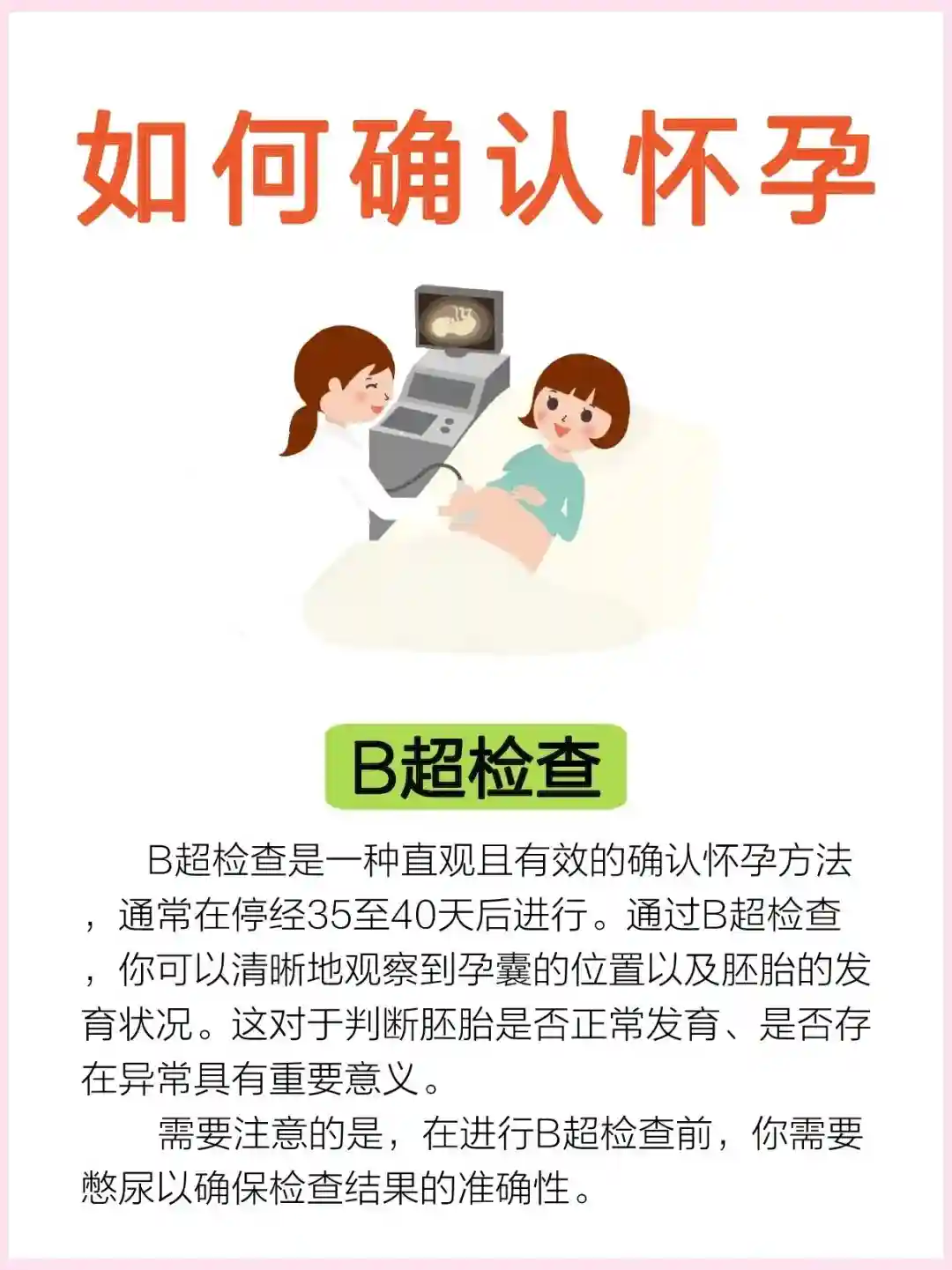 B超检查是一种直观且有效的确认怀孕方法,通常在停经35至40天后进行。通过B超检查,你可以清晰地观察到孕囊的位置以及胚胎的发育状况。这对于判断胚胎是否正常发育、是否存在异常具有重要意义。
