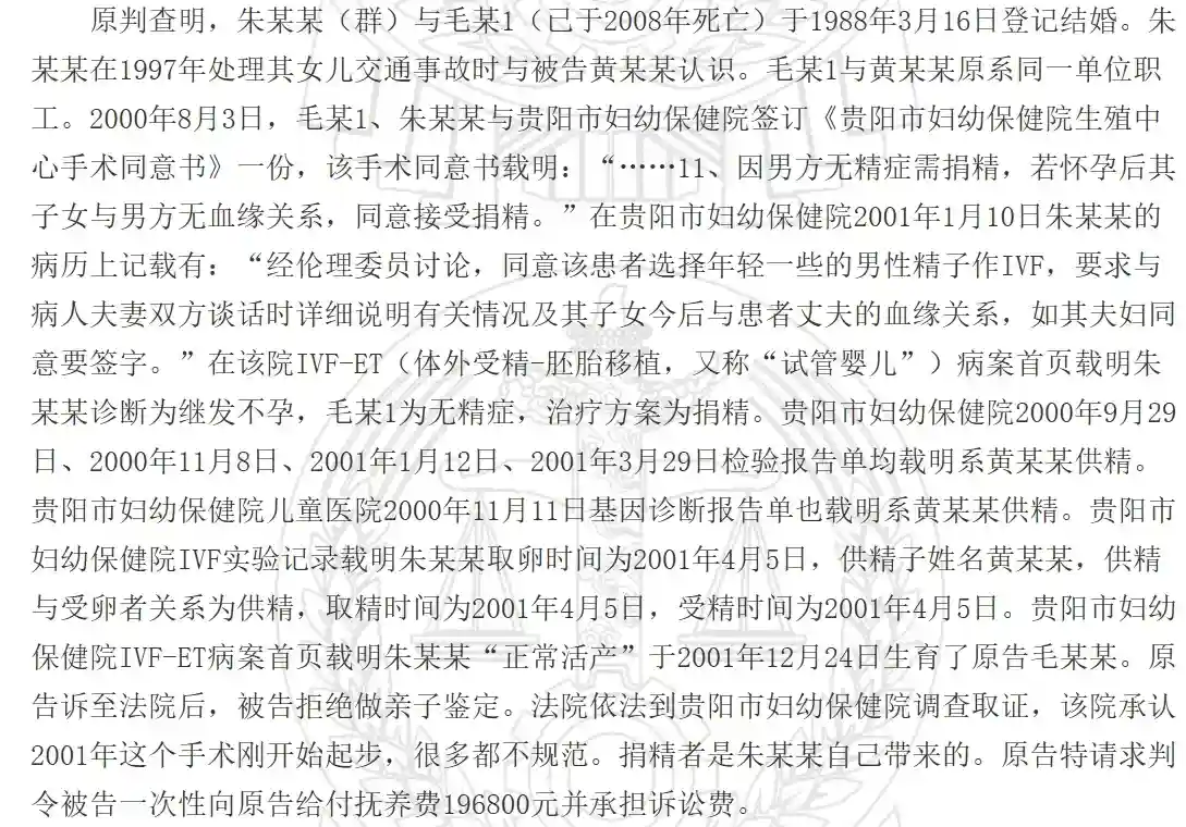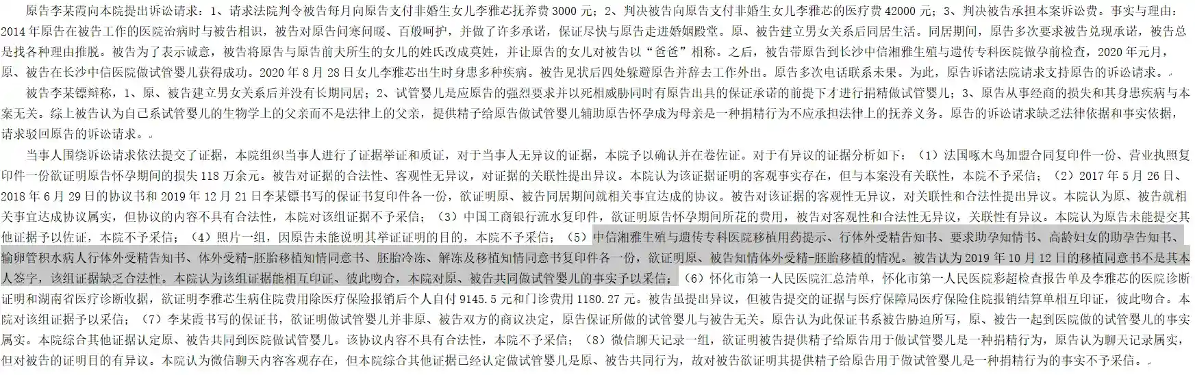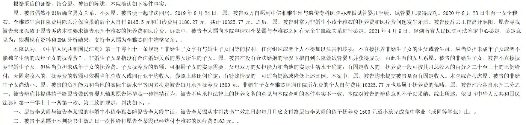 如果情侣间男方给女方非匿名捐精,就要看裁量权了,法院如果认为是双方共同做试管,那么后代就是非婚生子女,捐精人就要承担抚养义务。图3.4的案例就是法院根据医疗文书认为,男女双方是共同做试管婴儿,即使女方写了保证书说做试管是女方单方行为,不是双方商议决定的,聊天记录也表示出男方是捐精,也不被法院认可。(案例见图3.4)
