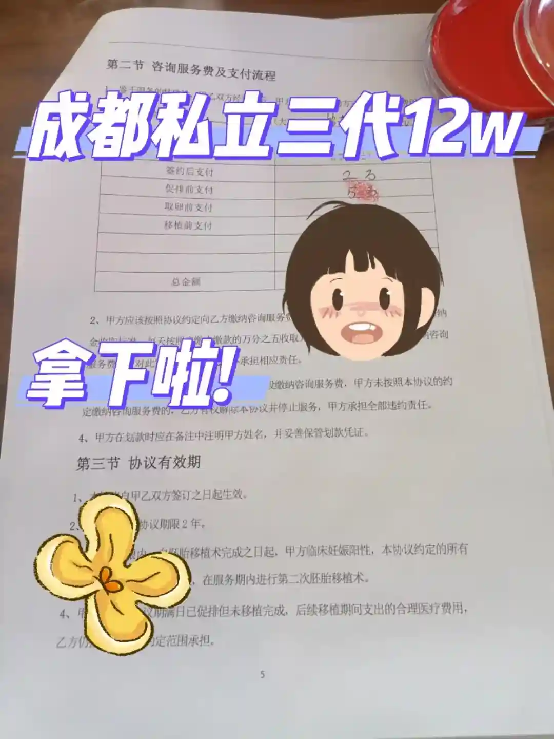 网上做了好多功课,咨询了不少私立机构,也实地考察了好几家三代机构。从专业团队的资质,到过往的成功案例和整体的服务流程,对比分析。最终选定了成都锦江区的一家私立机构,他家在这方面口碑很好,成功l很可观。12w包的价格。今天正式签约啦!
