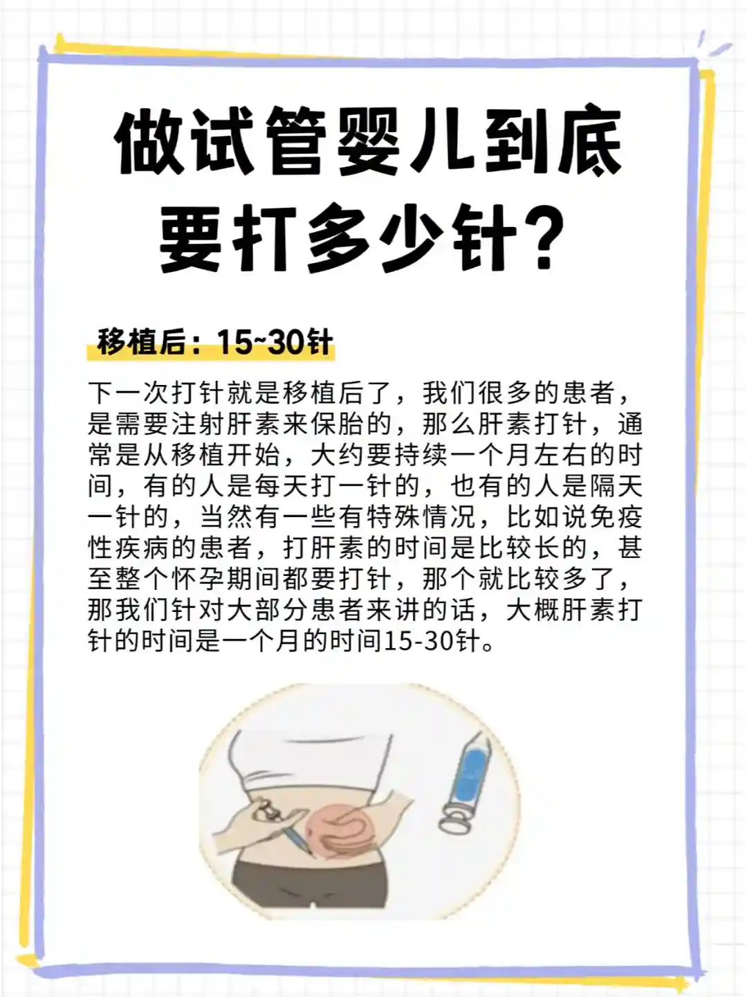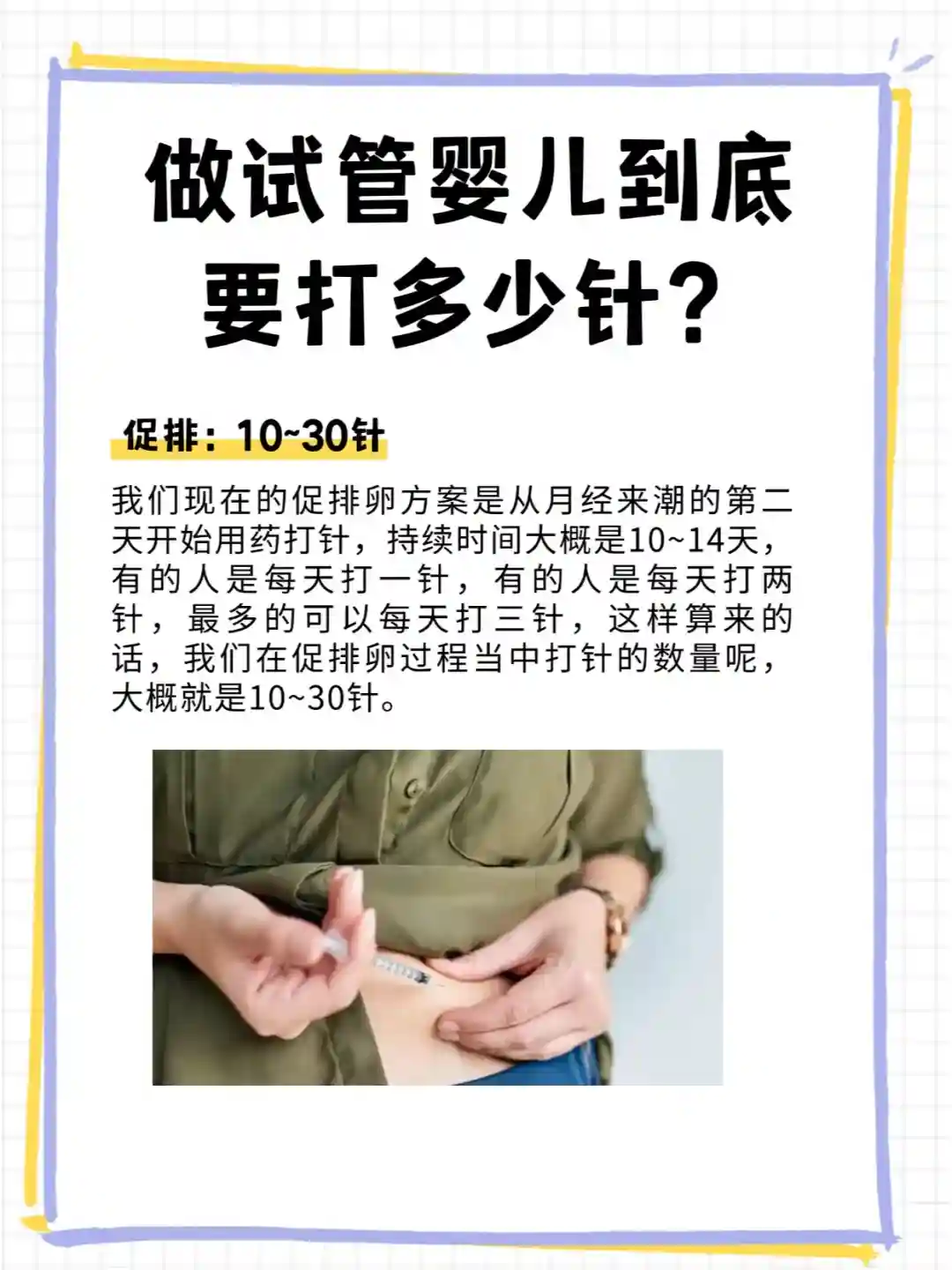🔍所以这样整体算下来呢,我们做一个试管周期大约需要打30~50针。虽然,我们现在做试管的很多针呢,都是皮下注射,痛感并不很明显,但是,要打这么多针,我们的孕妈妈,准妈妈们还是非常辛苦的,但是为了我们获得一个健康的宝宝,受这些苦呢,大家都是觉得值得的,这里呢,我也要提醒我们的男士们,一定要充分的理解和支持我们这些试管的姐妹们。