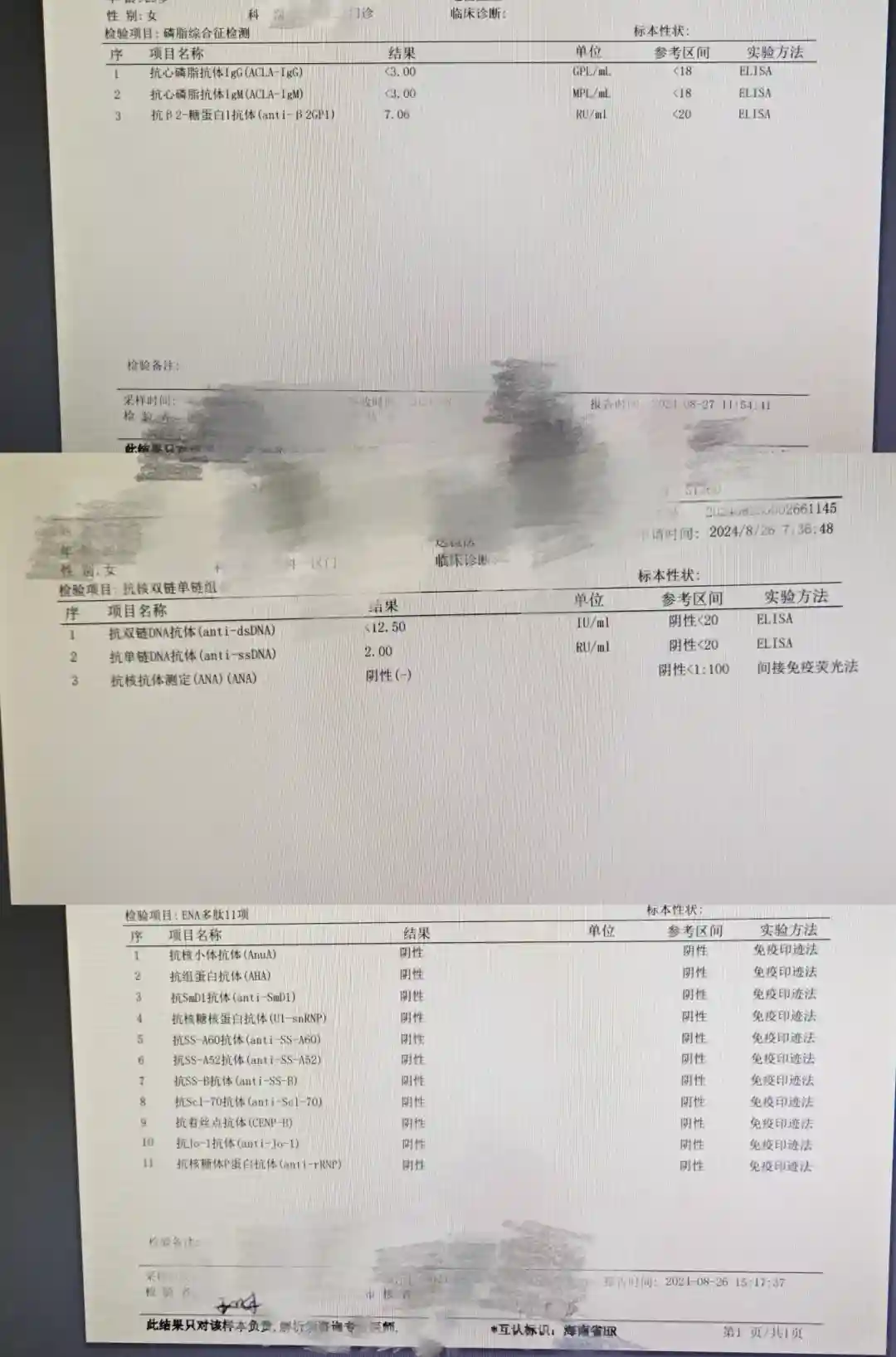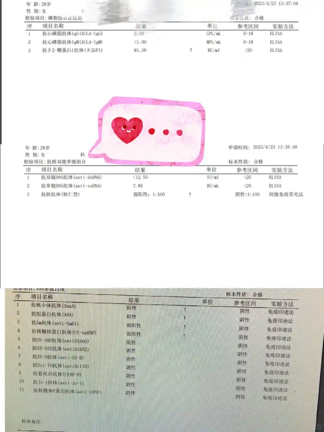 去年4月份常规检查发现某些风湿免疫抗体阳了(如图一),但自己没什么症状,问了医生,说倾向于红斑狼疮,但没症状就定期复查就好,备孕怀孕就得吃药。后面每三个月到半年复查一次,复查了三四次,ENA抗体谱没啥太大变化,但磷脂综合症相关抗体β2糖蛋白抗体每次复查都在降低。今年4月份查出怀孕,马上又复查了一遍,ENA抗体谱还有一点点阳,但β2糖蛋白抗体阴性了,所以自己和家人就决定怀孕就不吃药了,孕中期复查抗体全阴了(图二)。从发现阳性到全阴,没吃过药,最大的改变就是心情变好了(去年发现阳的时候是和前男友三天一大吵两天一小吵的内耗生活,分手后遇到现在的老公,每天好心情)。我自我感觉抗体阳有可能是我新冠二阳引起的(那时候刚刚新冠二阳结束不久,也有可能是心情低落引起的。总之,好好生活,不要因为抗体阳了就焦虑。