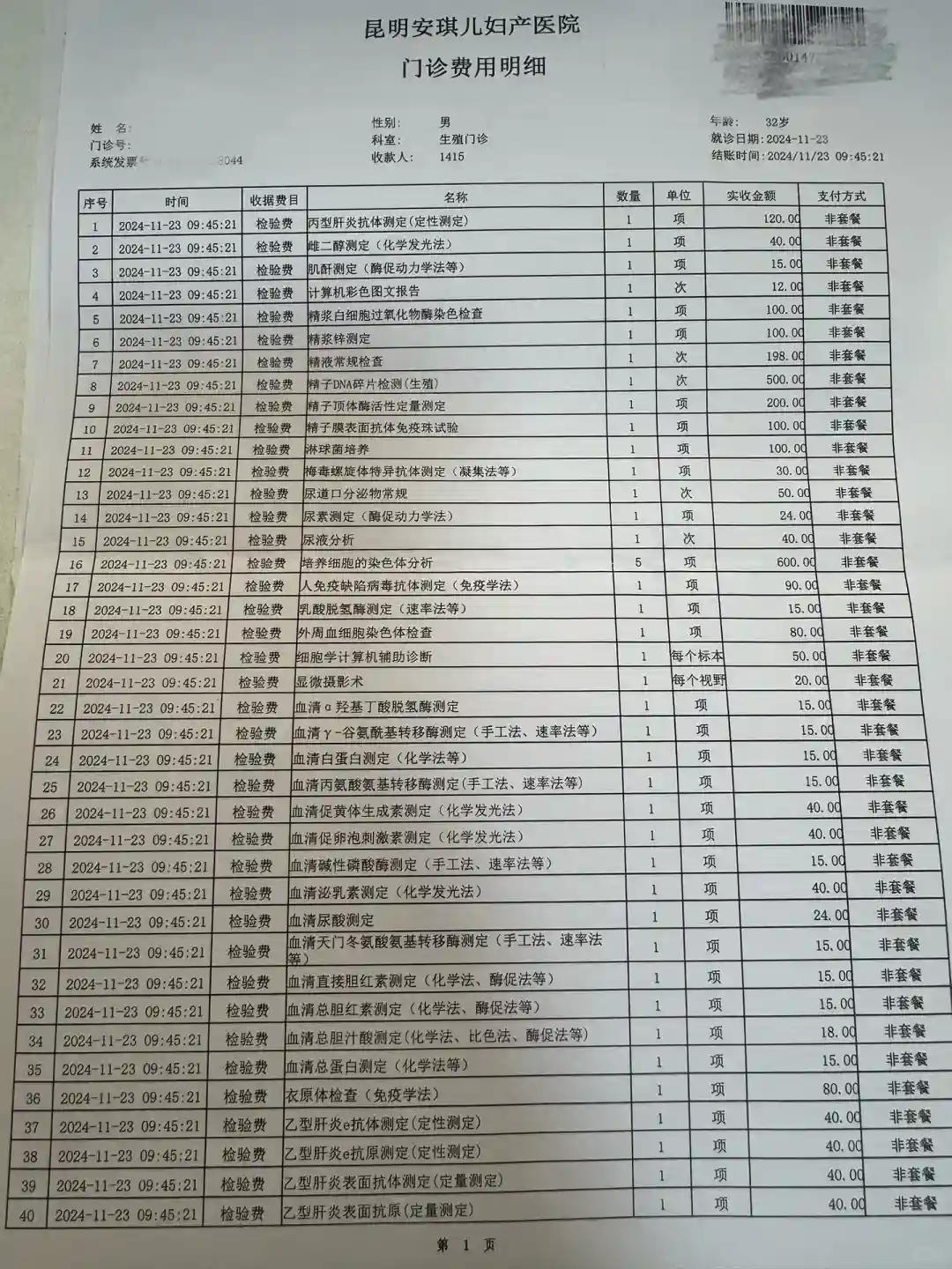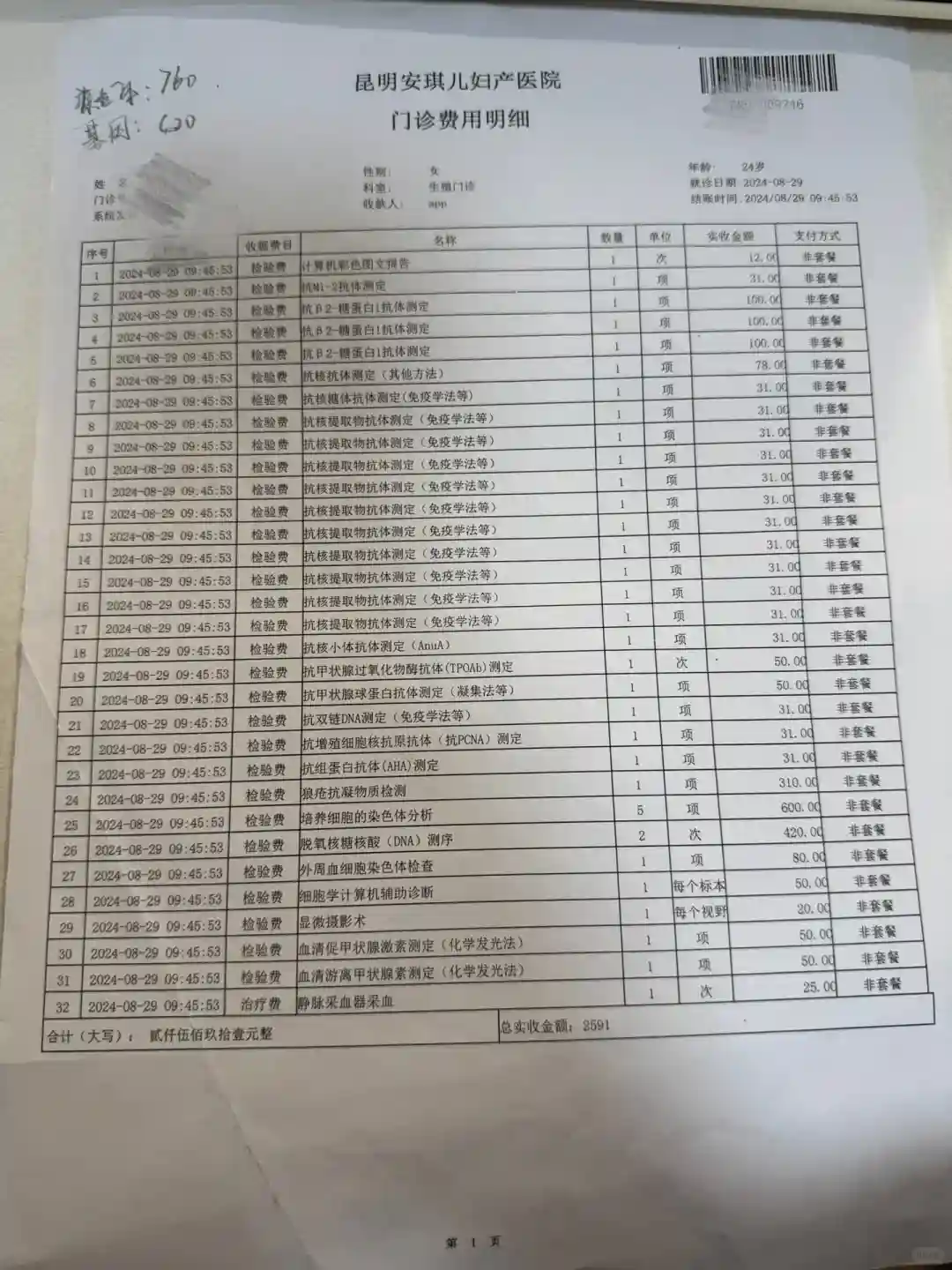 首先P2是试管前期检查的费用,其中部分云大检查的花了1205.8元,分针是降调分针655元,合计10331.84元(不包括挂号费)