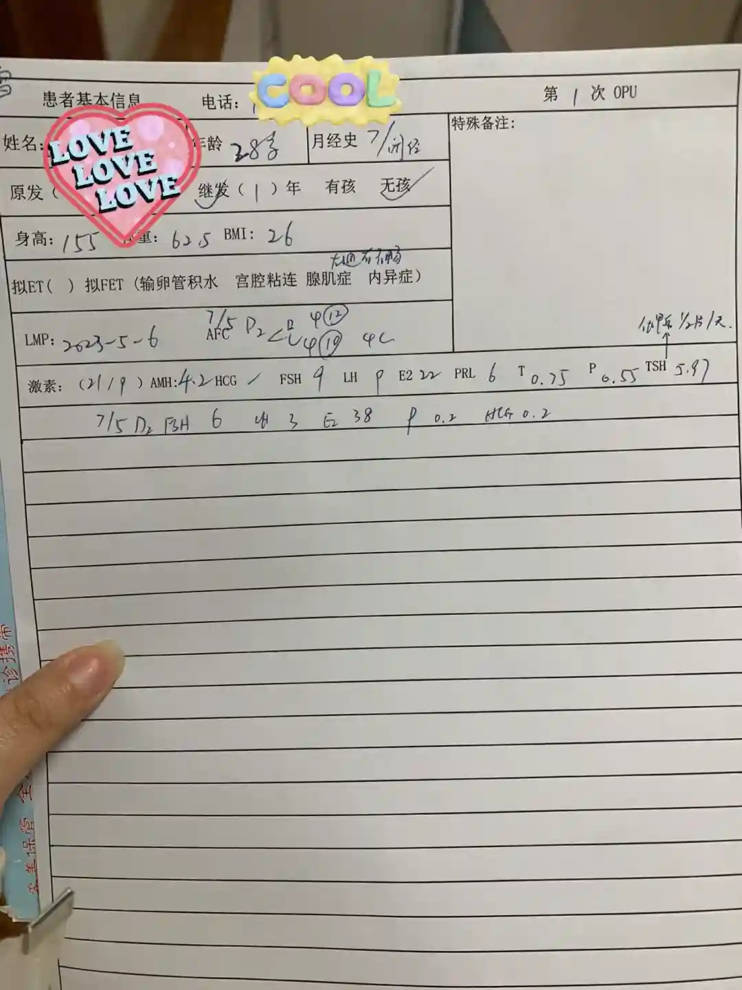 今天7.30到医院抽了血,然后三楼刷卡做B超,等快十点抽血结果才出来,才能刷卡看门诊。因为我网上预约的号比较靠前,基本刷完卡没用等,就喊到我了。然后就是去病案室拿了我建档时的大病历,医生写了一张纸(图3),把这张纸放B超市,她们会联系黄主任,等黄主任确定好方案,再叫你去诊室开药。最终确定了是拮抗剂方案,今天普丽康175lU,明天5.8早上8点前再去,黄主任亲自给做B超。这里不得不提醒一下准备在徐州妇幼试管的姐妹,我建档的时候医生说,月经第二天或者第三天去,最好是第二天。我昨天月经,打电话问了医院,今天黄主任不在门诊怎么办,医院说挂普通号就可以,都是黄主任定方案。其实我已经提前挂了黄主任8号的号了,8号第三天也可以去的。我看xhs上别的姐妹分享的,基本都是打几天针再去做b超,我怎么就打一针,第二天就要去呢?一针能看得出效果吗?我感觉就是因为今天没见到黄主任,明天才让我再去一趟,还要多做一次b超。而且黄主任不在,我等了挺久才出方案,中间去问了一次,说是黄主任没接电话。所以,姐妹们最好还是趁黄主任在的那天去定方案比较好。