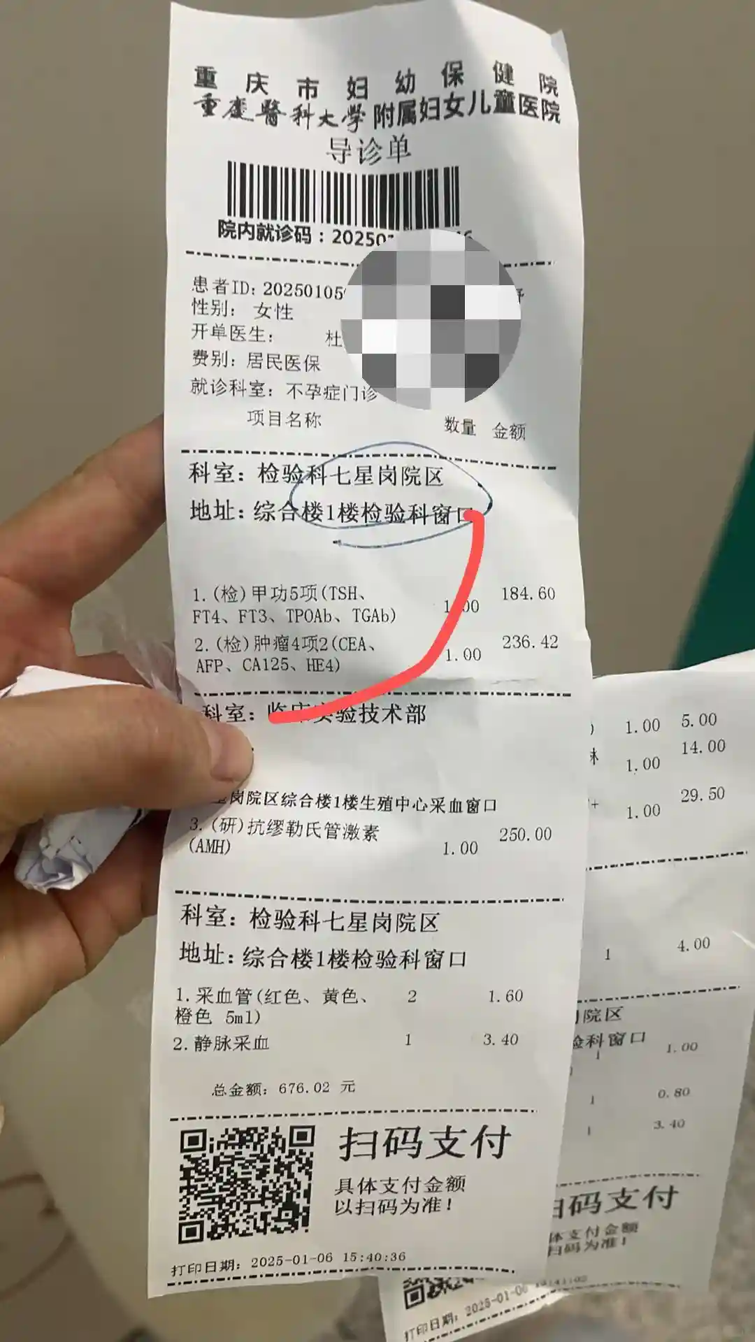下午赶去七星岗妇幼保健医院准备直接做试管,医生说要全面检查哪里不行了才能做,不然没得指标!由于姨妈期间不能检查很多,我看到还要检查肿瘤和甲功加起来检查费900多,会不会过度检查哦?我想反正现在都不能检查,问哈社区有没得免费检查的,社区说有,于是我赶回去填报材料,预约姨妈结束后去检查了再决定了……能省点是点