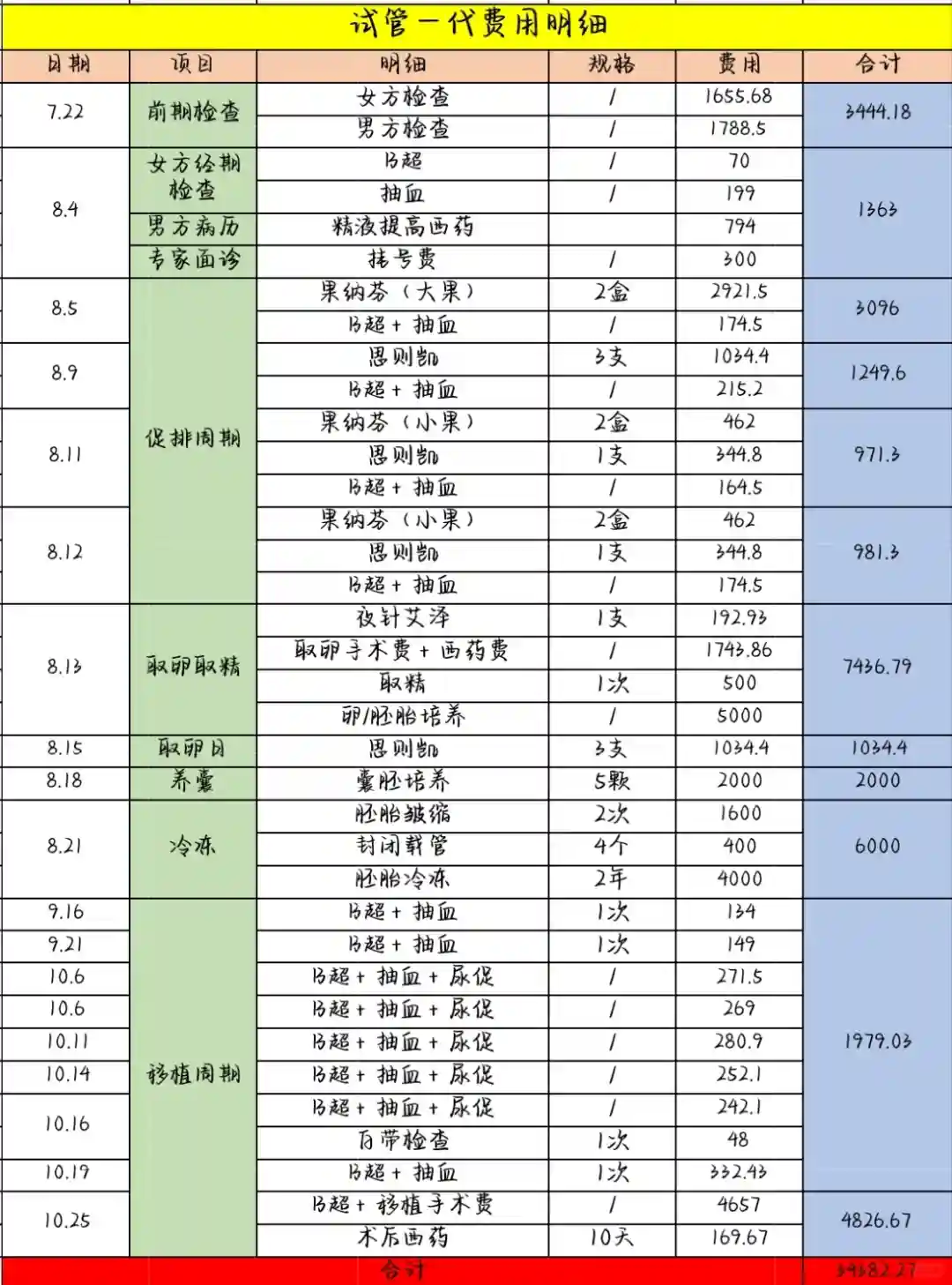👉大概几个重大节点的费用明细就是如此,取卵取精费用高是包括了取卵手术和胚胎培育的费用哦。
