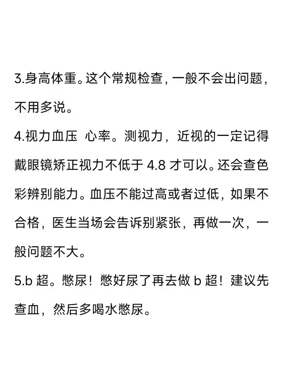 3.身高体重。这个常规检查,一般不会出问题,不用多说。