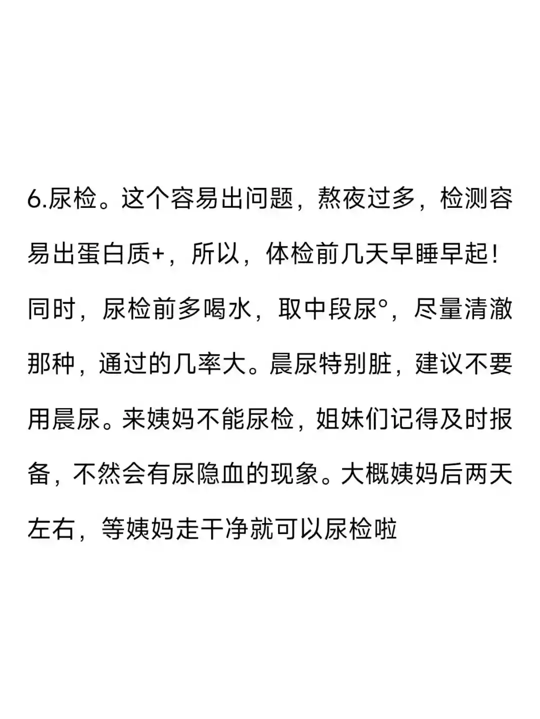 6.尿检。这个容易出问题,熬夜过多,检测容易出蛋白质+,所以,体检前几天早睡早起!同时,尿检前多喝水,取中段尿°,尽量清澈那种,通过的几率大。晨尿特别脏,建议不要用晨尿。来姨妈不能尿检,姐妹们记得及时报备,不然会有尿隐血的现象。大概姨妈后两天左右,等姨妈走干净就可以尿检啦