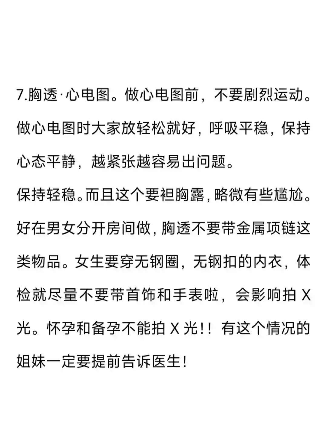 保持轻稳。而且这个要袒胸露,略微有些尴尬。好在男女分开房间做,胸透不要带金属项链这类物品。女生要穿无钢圈,无钢扣的内衣,体检就尽量不要带首饰和手表啦,会影响拍X光。怀孕和备孕不能拍X光!!有这个情况的姐妹一定要提前告诉医生!
