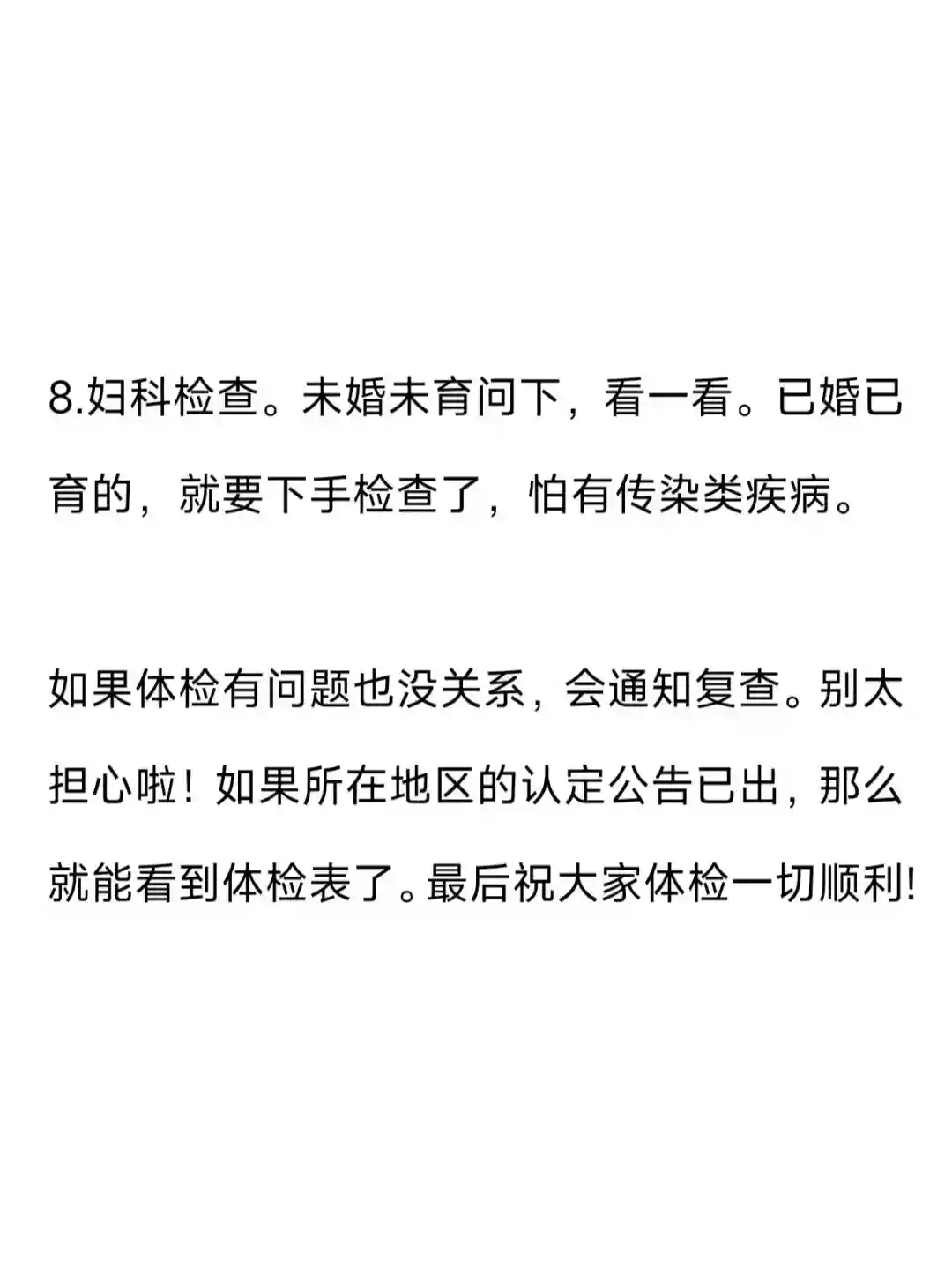 8.妇科检查。未婚未育问下,看一看。已婚已育的,就要下手检查了,怕有传染类疾病。