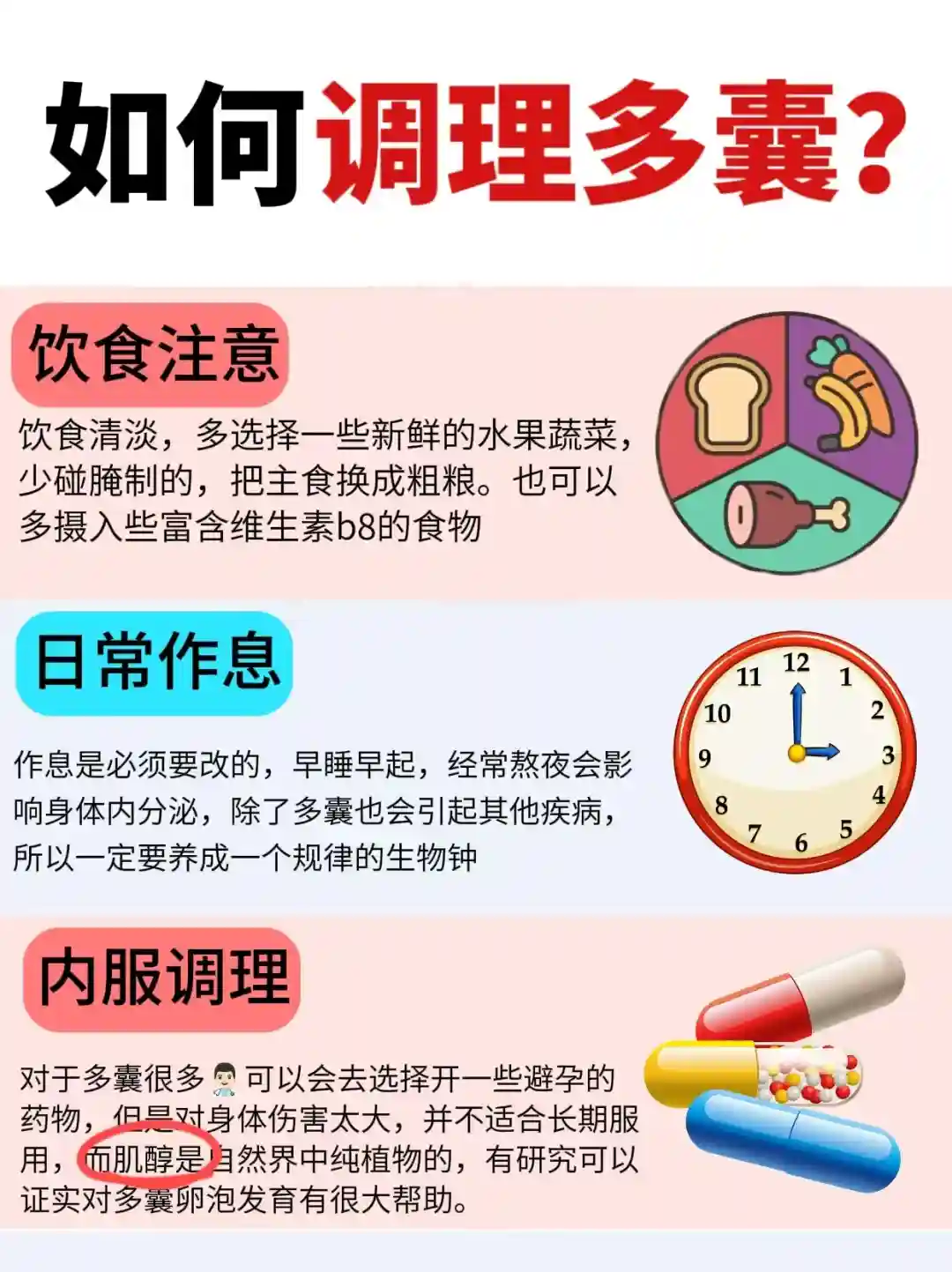 饮食清淡,多囊女生应多摄入一些低GI的食物,把主食换成粗粮,多选择一些新鲜的水果蔬菜,少选择腌制的。