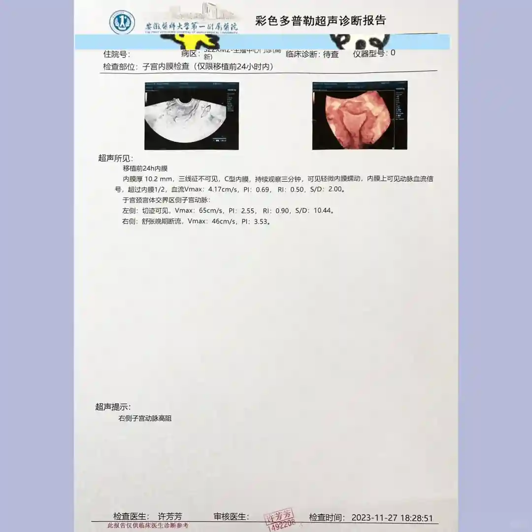 11.28移植日,这次花花要求在前一天做一个移植前24小时的内膜检查。提前电话预约好,在27日下午5点到门诊2楼超声科先取号,然后等待叫号。