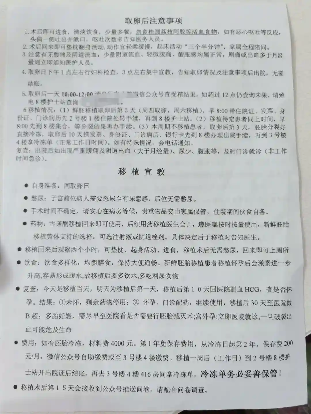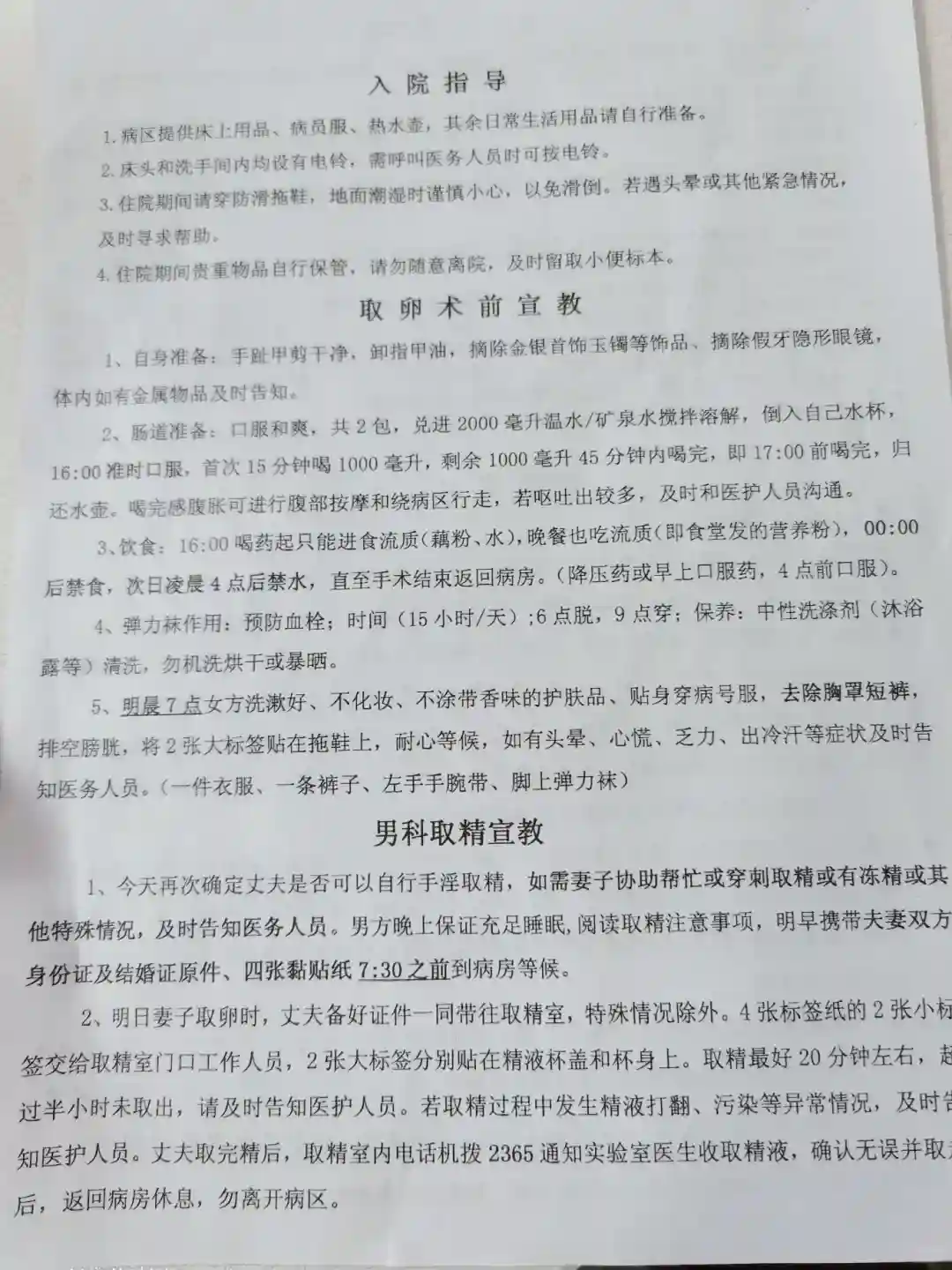 入院手续护士都会带着做,交资料-量血压-YD消毒,然后把一批的姑娘们估计有20来个统一集中在一间大病房,进行入院指导,每人都发了一张纸质指导单,见图二图三,内容很详细,流程已经非常标准化了。护士还给大家的耳朵贴了一颗黑色的东西,说帮助睡眠,蛮贴心的,表扬下省妇保护士,态度很好,很贴心,大部分医生也都很好,但是个别医生脾气还是有点差的