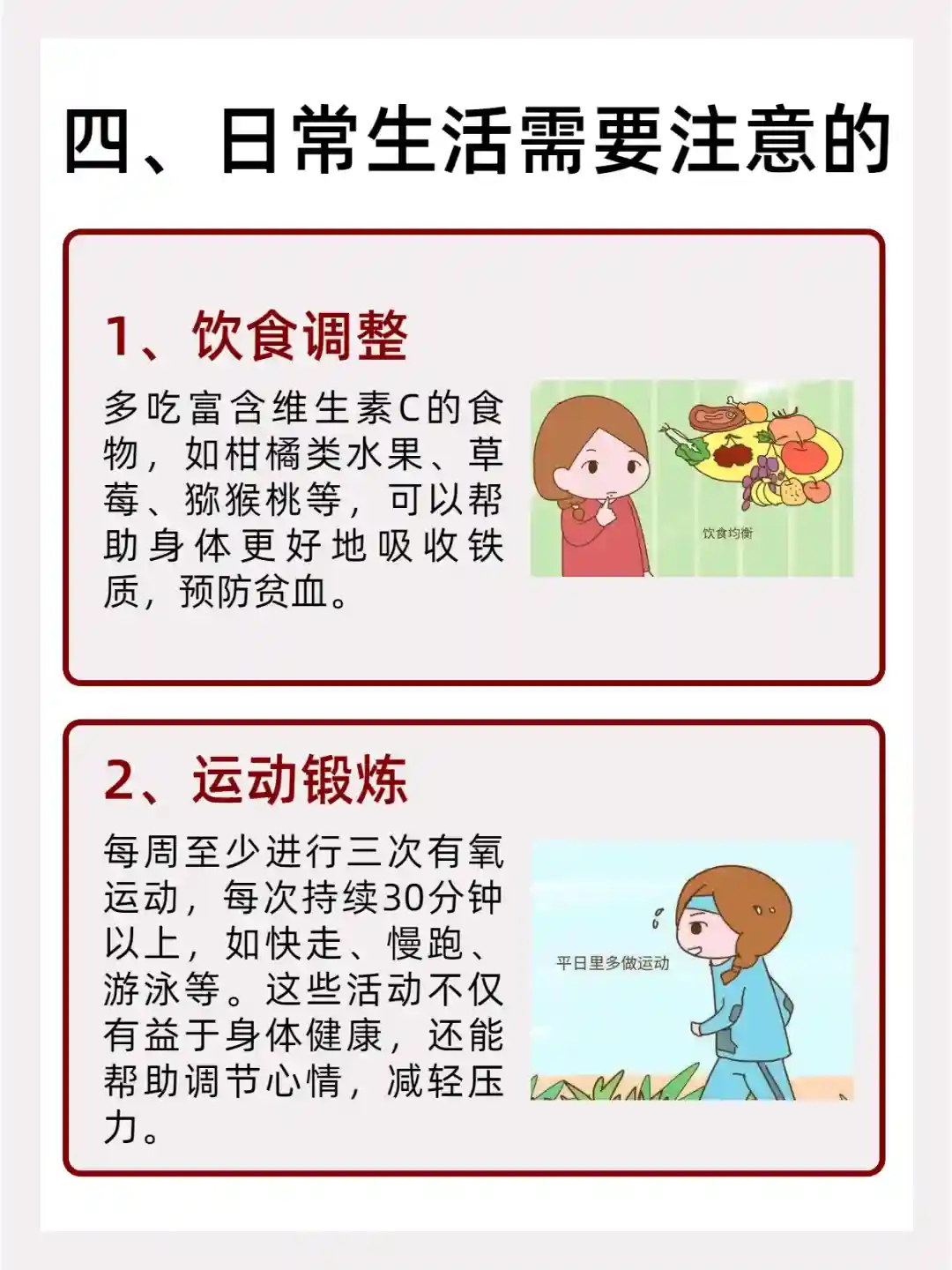 1、饮食调整:多吃富含维生素C的食物,如柑橘类水果、草莓、猕猴桃等,可以帮助身体更好地吸收铁质,预防贫血。