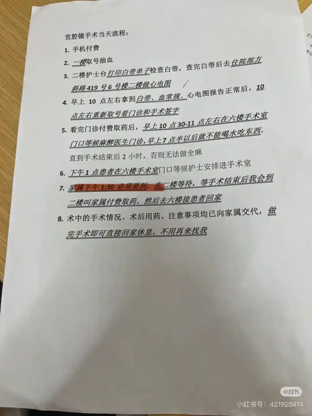 术前—准备血常规、肝肾功能、心电图(外院报告可用,集爱当天也可以查)手术当天一早查白带。白带ok之后付款,拿药,等10:30去6楼做麻醉评估。上午的术前准备流程就差不多结束了。