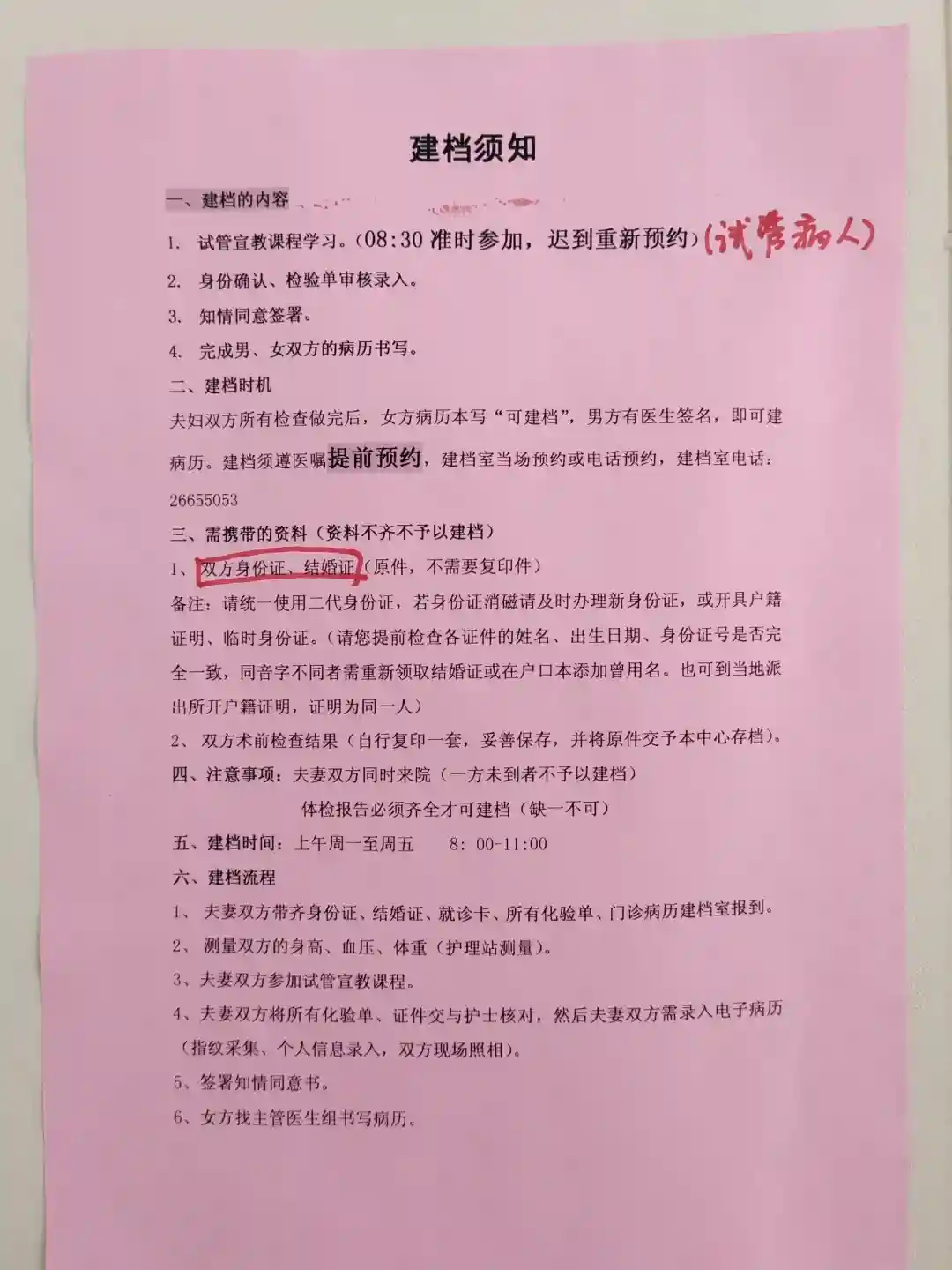 1、建档当天需要08:30前到达门诊,到了双方先取号签到,如果时间充裕先在导诊台前测量体重,生殖科科室门口测量血压和心率,拍照保存,后续写在护士给的一张纸条上面,并填上自己的相关信息。