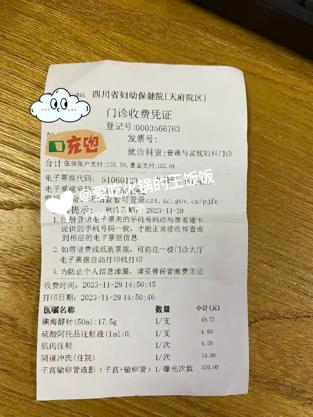 用药三天后去社区医院复查了白带,清洁度降到二度了,挂了下午的号找医生去开检查单,需要把之前做的血常规和尿HCG以及当天复查的白带常规单子带上,在医生诊室做了个阴道冲洗(说是降低感染风险),医生开好单子后先去放射科问当天是否可以做(放射科会问带没带家属,拿了卫生巾和卫生纸没有),能做的话就去缴费拿药,阿托品拿去去急诊打屁股针,碘油交给放射科的排号窗口,等屁股针打完15-20分钟后医生就会安排进去做造影了。
