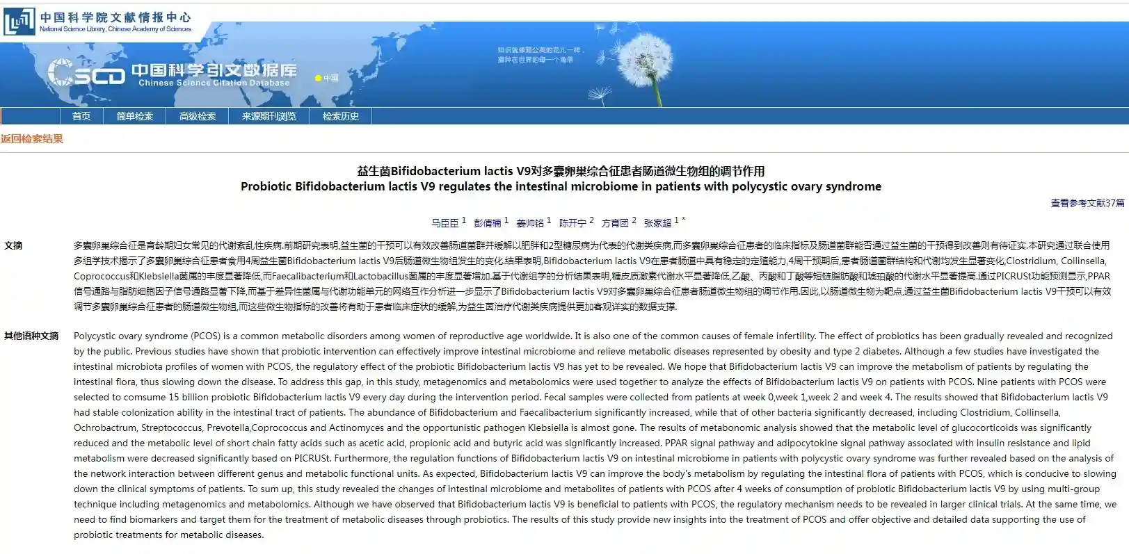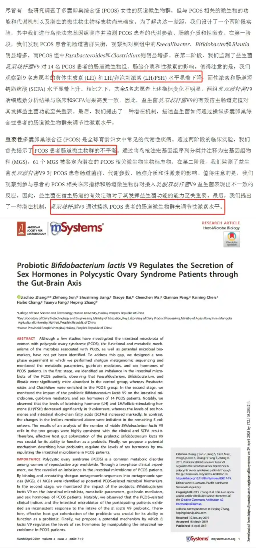 一些研究调查也发现多囊患者的肠道菌群失衡。多囊不只是卵巢疾病,肠道菌群紊乱也可能是凶手!通过肠-脑轴影响了下丘脑-脑垂体的性激素分泌,从而会使得LH/FSH紊乱。图三是一篇发表在mSystem的文章(上面是我转译的中文,下面是英文原文),该试验表示乳双歧杆菌V9通过操纵肠道微生物来调节性激素水平会使LH/FSH的水平显著下降。同时图三是中国科学院文献情报中心的一篇文献,该文献也指出乳双歧杆菌V9对多囊卵巢综合症患者肠道微生物组的调节作用。这些说明调节肠道菌落有可能是我们攻克多囊的一环。