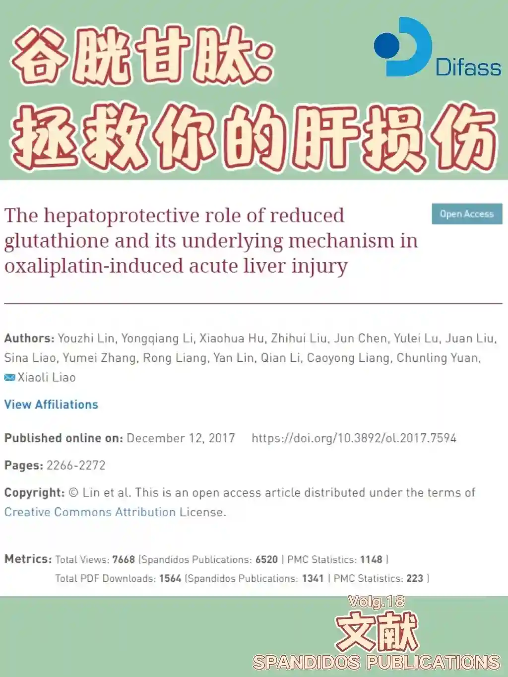 2017年在SPANDIDOS PUBLICATIONS上发表的一篇📃《还原型谷胱甘肽在奥沙利铂致急性肝损伤中的保肝作用及其机制》中,为了研究还原型谷胱甘肽Z疗对奥沙利铂诱导的 急性肝损伤的影响,用还原型谷胱甘肽(400 mg/kg,ip)Z疗小鼠。