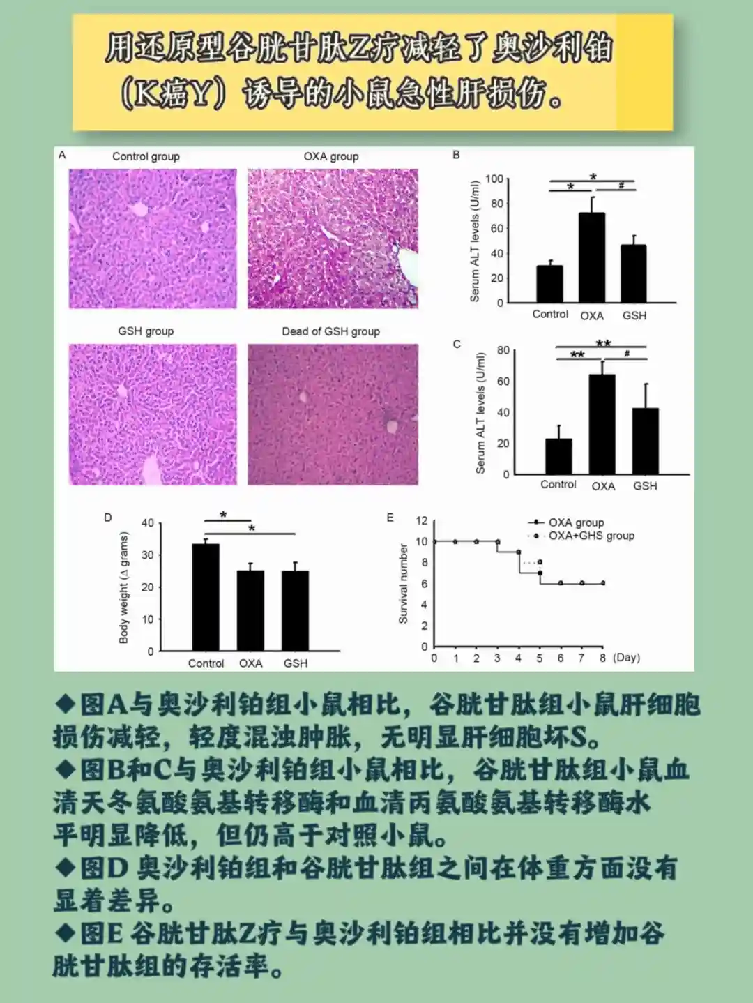 📍结果显示还原型谷胱甘肽用于奥沙利铂诱导的急性肝损伤小鼠,肝组织病理损伤减轻,血清血清丙氨酸氨基转移酶、天冬氨酸氨基转移酶(血液检测中判断肝细胞损伤程度的项目)显着降低。基于谷胱甘肽的保肝疗法可以部分抑制氧化应激并减轻奥沙利铂诱导的急性肝损伤。▼