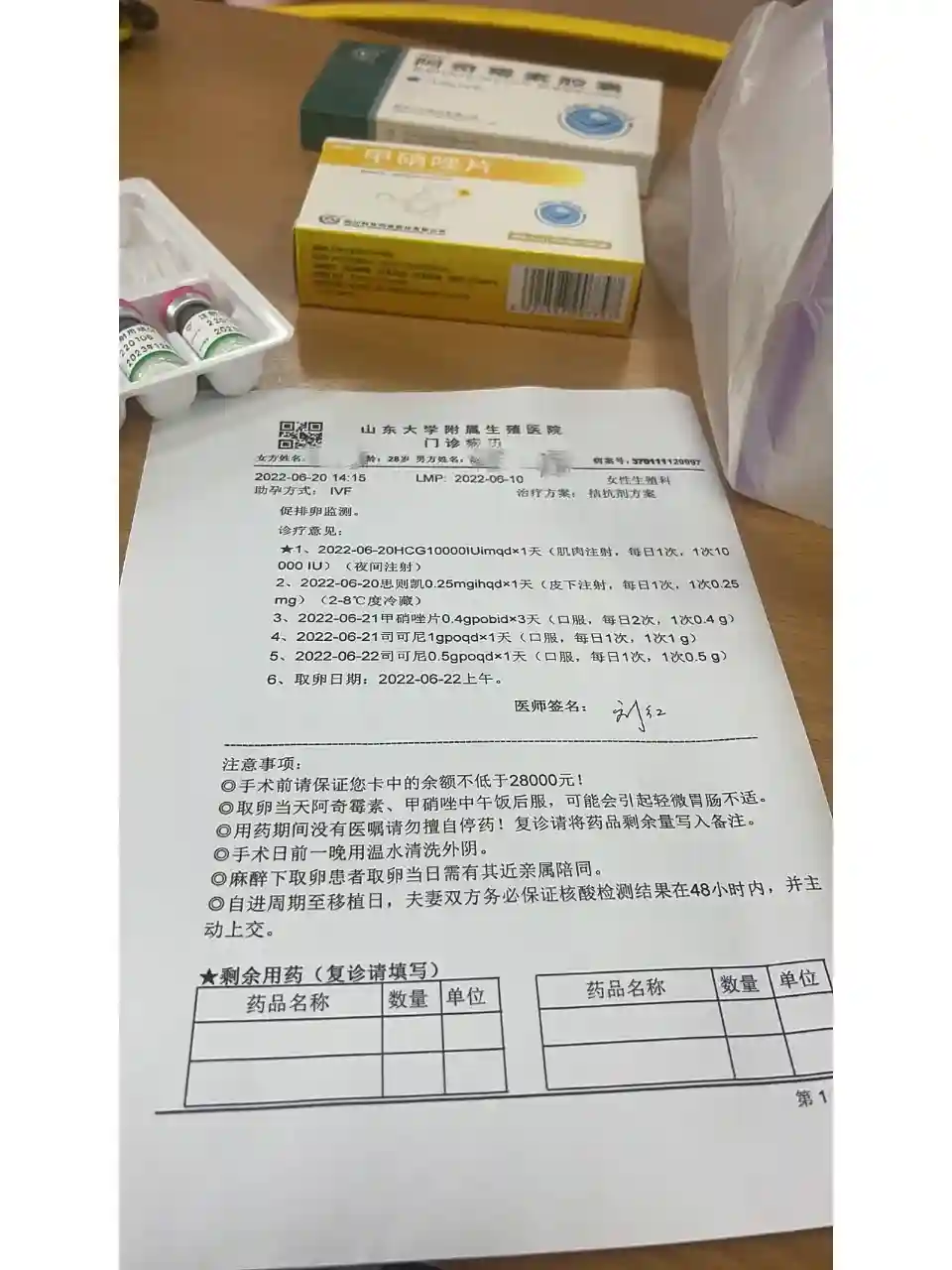2022年2.28号来到了济南山大生殖,看的刘红主任的坐诊,刘红主任给我开了要检查的所有项目,两天的时间,跟我老公我俩就查了3/1了,剩下的要再来月经的时候,还有一些回当地做的,回去之后我也马不停滴的把在当地做的检查做完了,等到了月经期我又返回了山大,把该做的检查做了,在等下次月经的时候准备促排了,然而,疫情耽误了两个月……疫情过去后,又等到了月经期,又返回山大,当时刘主任跟我说,建议我在减重,要不效果不好,成功率也低,当时我自己去的,我老公没去,我也不知道该怎么样,没人商量,我说直接促排吧,刘主任就给我开了促排针💉我就开始了我的5222促排,第一个2天反院的时候我就跟我老公去济南住下了,促排期间抽血胳膊都扎青了,但是功夫不负有心人,等到了我的夜诊,当时挺激动的,一开始8个卵泡,不知道为何,最后就取了4个,还有点小失望,怕都不行,等待移植的三天里,疯狂喝水,溜达,就怕卵巢刺激,移植不了,但是更怕的是我的崽崽们,在结合不了啊,不分裂啊,三天天天做梦,就怕医院打电话,终于熬到了移植日,当天又兴奋又紧张😓下午早早的我跟我老公带着给宝宝们买的糖,奶就来到了医院等待移植,超级快,就几分钟,移植完了,出来跟我老公说,好神奇啊,我肚子里有两个崽了,可兴奋了🥰,回去又躺了两天,我妈跟我妹亲自开车🚗来接我们回去的,移植后等到开奖真的煎熬啊,看到比我早的小伙伴们都在测,在第六天的时候,我忍不住了,测了一下,不认认真真仔仔细细的盯着看👀,都看不到,我当时有点小小的激动,也没告诉我老公,第二天,早上六点我就起来测了,一看比前一天深,我就更激动了,但是给我老公看,我老公都没看出来,直到一天比一天深,一天比一天明显,开心坏了😄反院抽血确定怀孕没怀孕🤰,看诊的时候,刘主任的助理第一句话跟我说的是“恭喜你,怀孕了”我听到这么肯定的结果差点激动的哭了,刘主任说血值很漂亮,回家养着就好了,我就跟我老公开开心心的回家了传给所有正在试管备孕的姐妹们好孕🍀