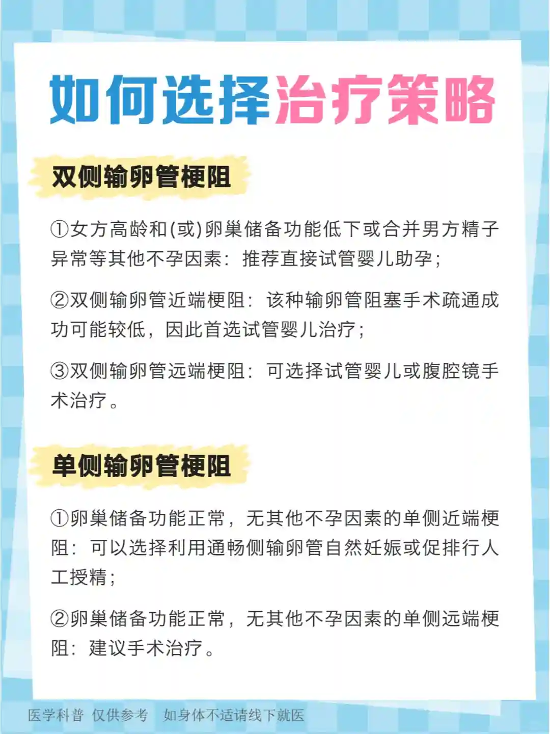 ✅具体采用哪种方式,要在充分评估夫妻双方生育力的基础上,结合患者年龄、卵巢储备功能、输卵管梗阻范围及部位、是否有过输卵管妊娠史或者输卵管手术史以及患者的意愿综合考虑。‼建议患者朋友们听从医嘱,按照医生的指导来配合治辽。如果手术后自然备孕一年或者积极备孕半年还未怀孕的,建议立即选择试管助孕。
