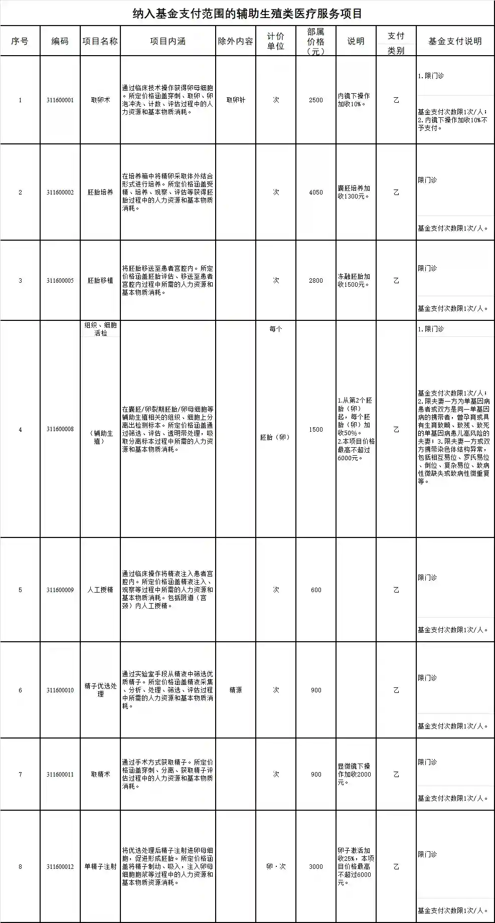 根据康幸保统计,8个项目纳入医保基金支付范围:包括“取卵术”“胚胎培养”“胚胎移植”“组织、细胞活检(辅助生殖)”“人工授精”“精子优选处理”取精术”“单精子注射”等。(见下图)