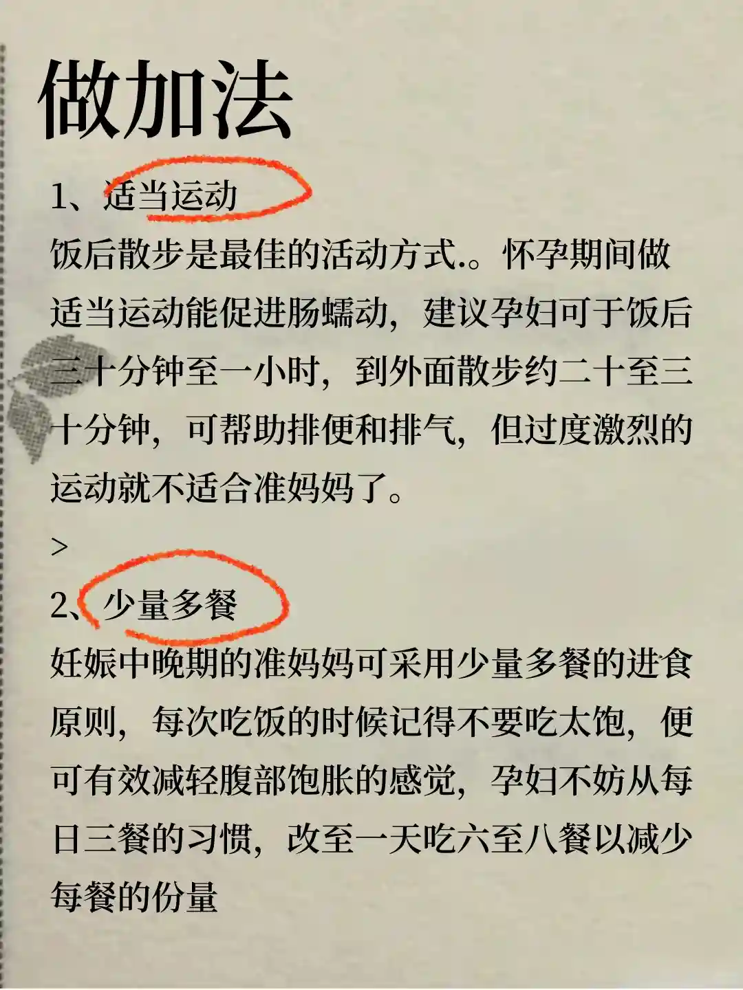 饭后散步是最佳的活动方式.怀孕期间做适当运动能促进肠蠕动,建议孕妇可于饭后十分钟至一小时,到外面散步约二十至三十分钟,可帮助排便和排气,但过度激烈的运动就不适合准妈妈了。