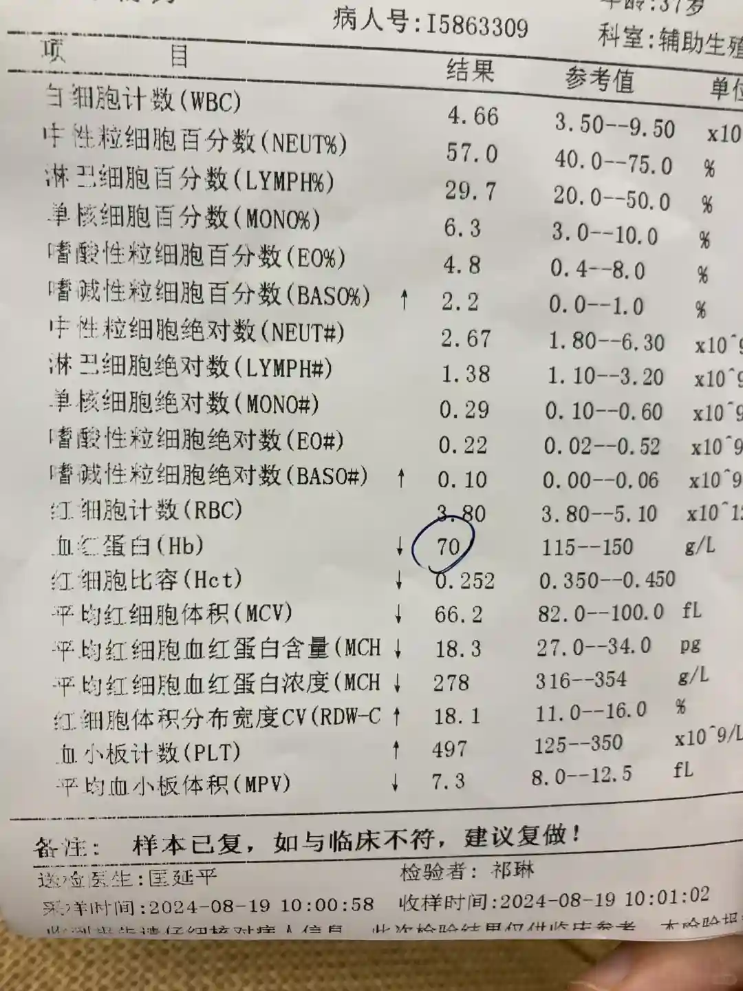 查出来严重贫血(血红蛋白70)我说怎么月经那么少,天天乏力,郜医生说你这按道理不能移植,在我的坚持下使用了自然周期让我什么药都不用吃了26号复诊