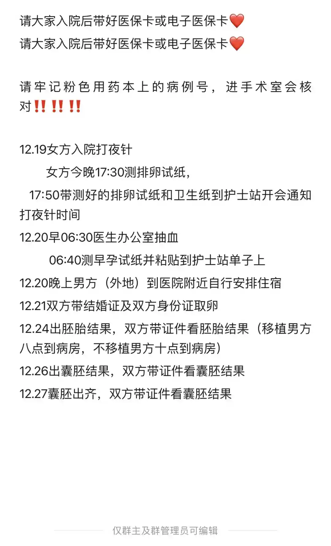 12.24移植鲜胚 移植需要憋尿,但不要喝水太早!我两次都憋不住去放掉,结果进了移植室点过名还需要等待半个小时左右,进移植室再重新喝水都来得及移植完就回家了,护士交代正常生活,不要久躺,坐卧不要猛起身,可以适当家务,清淡饮食,不要尝试之前没有吃过的食物,最最重要的是不要生气噢~