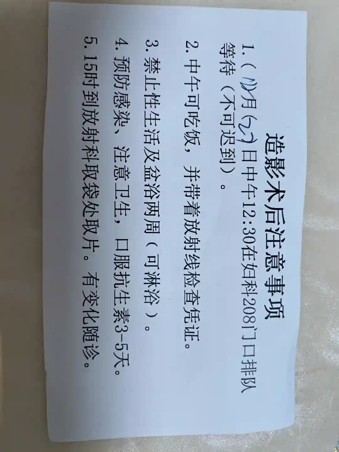 之后要做的就是小纸条上写的,口服消炎药五到七天预防感染,禁止性生活两周,禁止盆浴,淋浴可以,做造影当月不可以怀孕。