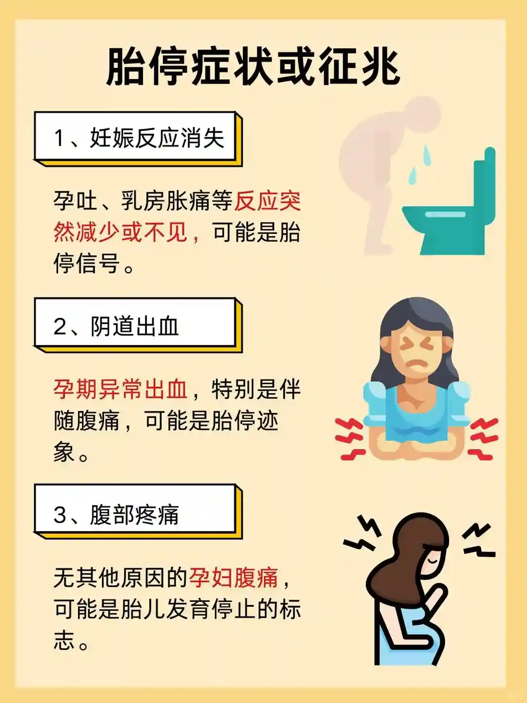 ❷阴道出血:在怀孕期间,如果出现不同于月经的阴道出血,可能是胎停的征兆,尤其是伴有腹痛的情况下。