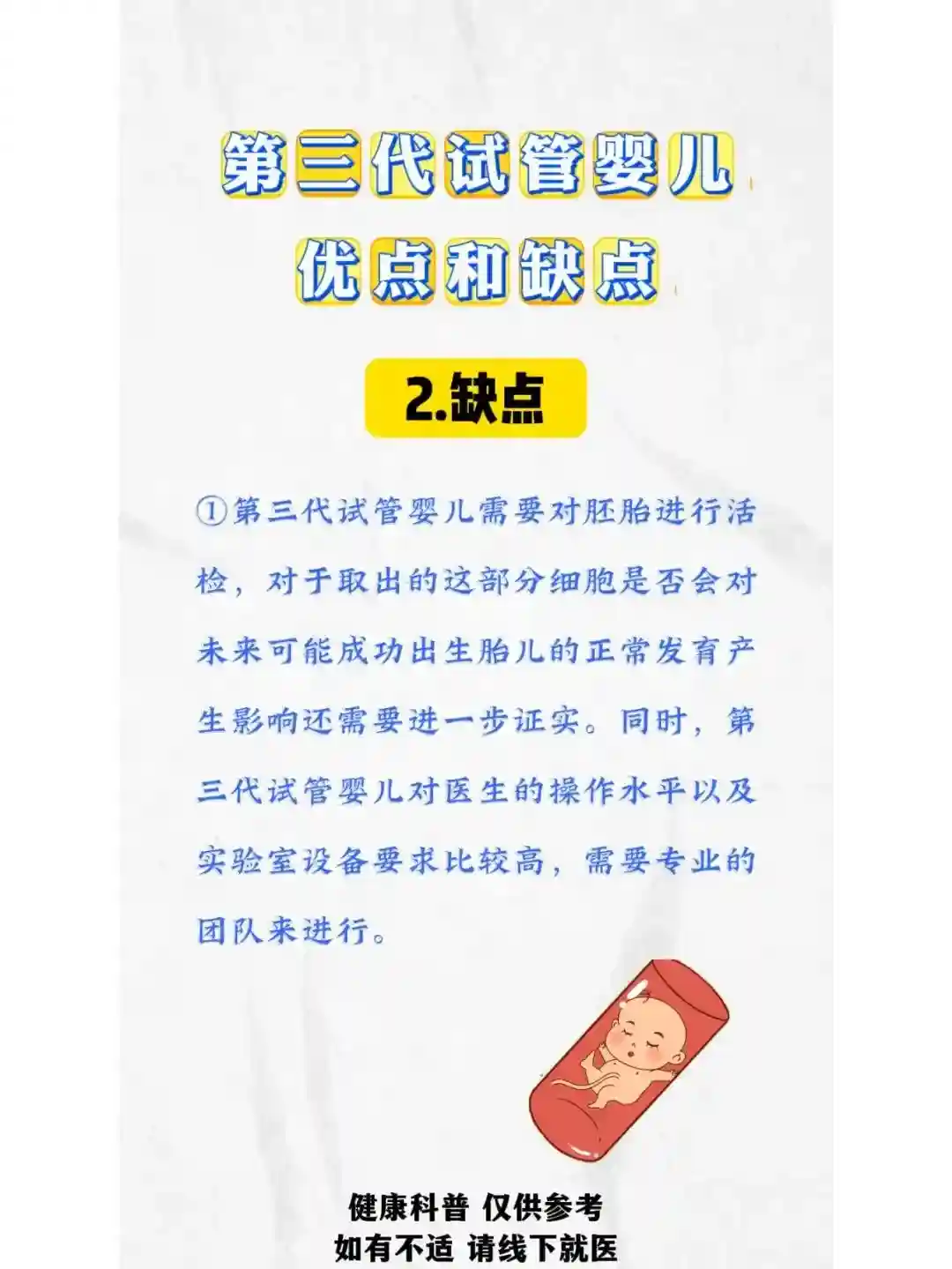 不过,姐妹们要注意,第三代试管婴儿需要对胚胎进行活检,这个过程目前还需要进一步验证,可能会影响未来宝宝的健康发育。同时,对医生的技术和实验室设备要求都很高,必须有专业团队来操作哦。🔬👩⚕️