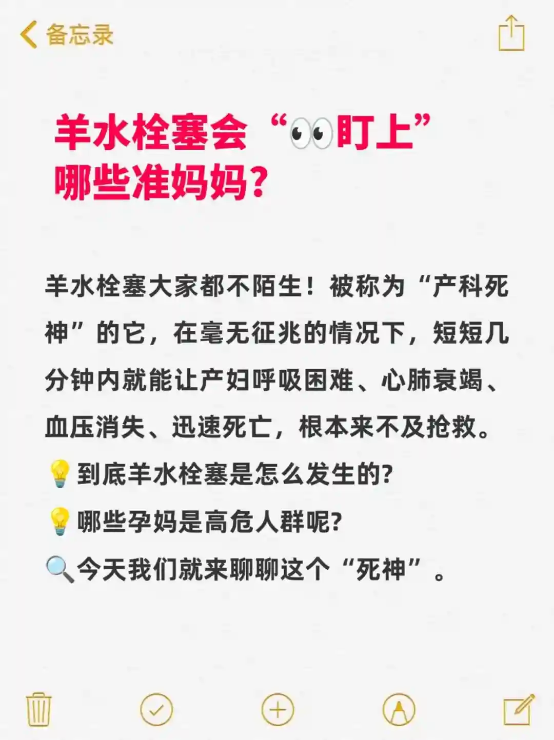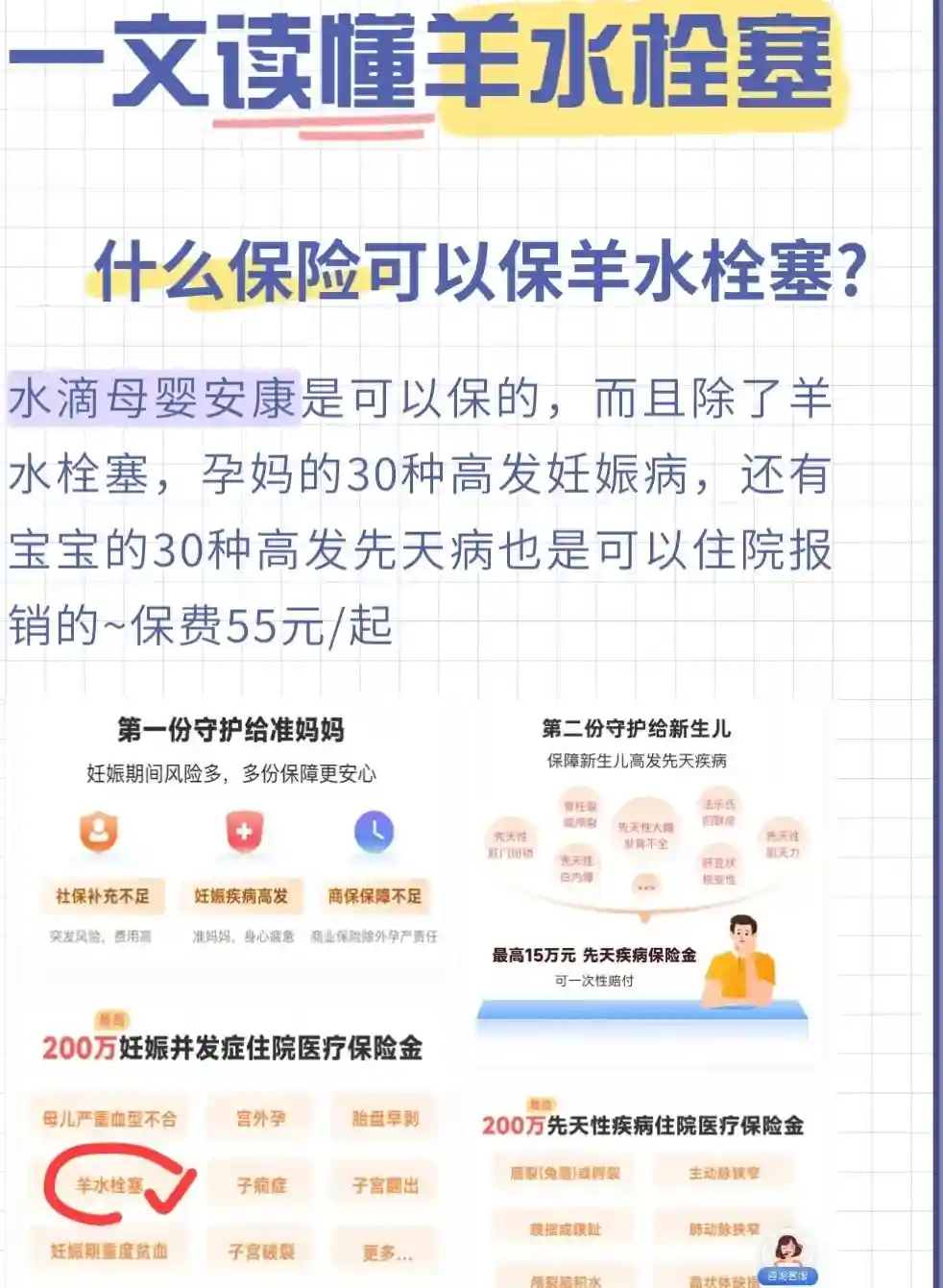 无论是不打算怀孕的,备孕,已孕的姐妹都需要了解下,孕期也可以投保一份保羊水栓塞的保险,我放到图里面了~除了保这个,孕期孕妇的高发风险+宝宝的高发先天病也包括了