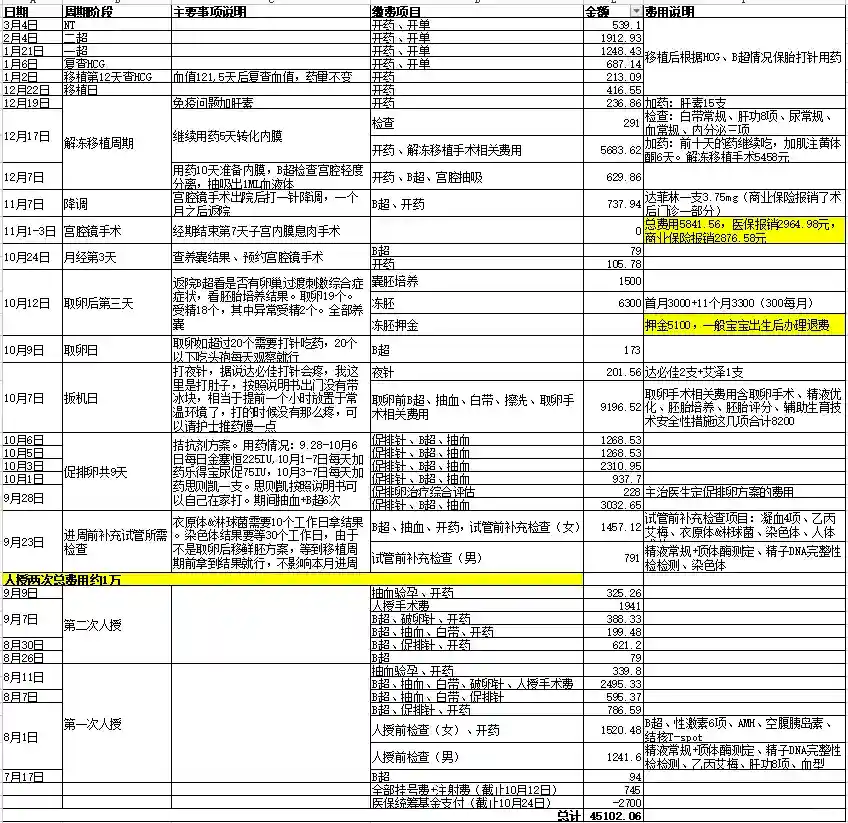 人授两次费用一共约1万,建档检查有一部分在当月刚好公司员工体检有做,省了一部分检查费。试管一促一移(含孕早期三个月保胎)费用约3.5万