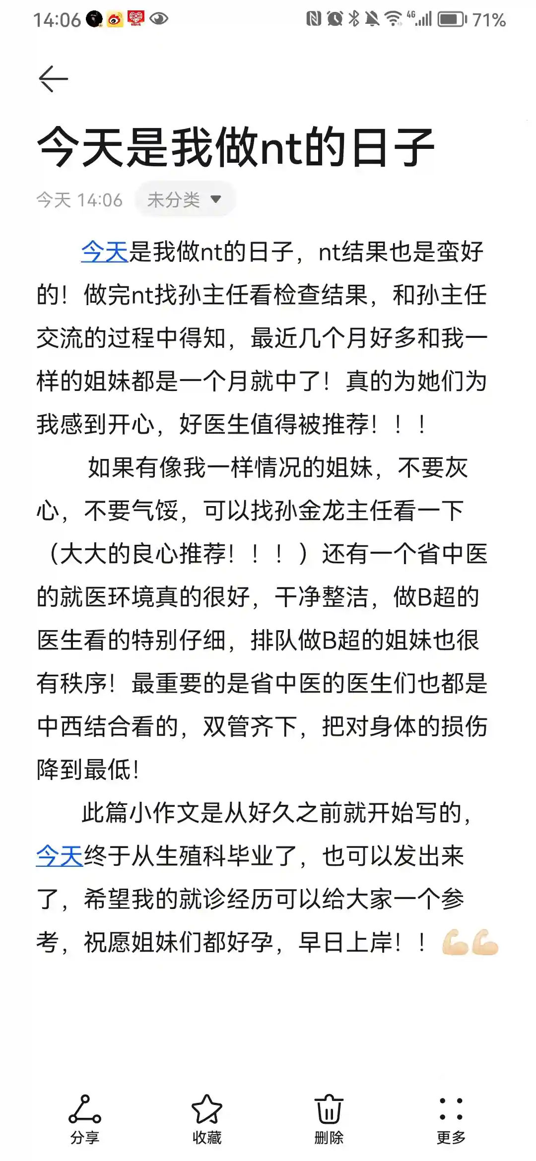 这个我真的挺有发言权的,曾有两次流产史,前两次都是三无,连卵黄囊都没有!amh值也很低,0.16,我才31岁,但卵巢的储存功能已经很不好了!经过前面的两次流产史,导致我一直不敢要孩子。直到今年,觉得时间差不多了,想着得开始备孕了。便从小红书上疯狂的搜哪个医院的生殖科医生比较好。小红书好多推荐连方和孙振高主任的,但这两个主任的号真的比抢茅台还难抢所以我自己又反反复复看了好几遍省中医每一个生殖科医生的简介,最后觉得孙金龙主任比较适合我。因为我清宫两次,害怕宫腔环境和输卵管方面不好,卵巢功能也不行,看简介孙主任擅长这些,所以就直接挂了孙主任的号。对孙主任的第一印象也特别好,温文尔雅又不失幽默,给开的每一项检查都会详细的说明。后面孙主任给我开了查输卵管的检查,检查后发现输卵管左侧上举,右侧通而不畅,伞端还有黏连,而我左侧卵巢还有畸胎瘤,卵子数量也不多,真的是所有buff都叠加到一起了孙主任告诉我不要气馁,说可以吃中药调理一段时间,先自怀试试,不行的话再考虑试管 。此后我一周过去拿一次中药,孙主任每次都看的特别仔细,看舌苔,把脉,根据实际情况调理药方,最最关键的是,孙主任真的不过度开药,有的药苦,还会提前告知这个药不好喝不过度检查(印象很深的一次是我从小红书上翻得建议查免疫检测,我主动要求孙主任给我开单子查一下,孙主任当时和我说这个检查挺贵的,一般很少有问题的。但是我当时上头了,非要查检查结果出来后果然没问题,孙主任也没怪我不信任他,反而过来安慰我说,查完这也就放心了吧)真的神仙医生!就这样调理了差不多一个月,孙主任告诉我可以要了,当时我还问,这么快就要开始了吗后面就是监测排卵,主任让什么时候去就什么时候去,没想到同房第一个月就中了我们都不敢相信这么快,太牛了。怀上以后,孙主任也特别尽心尽力的随时监测宝宝的成长情况,每次做完检查的单子都会详细的和我说。药也是根据我实际情况来开,不会过度保胎,而我今天也要从生殖科顺利毕业啦!真的非常感谢孙金龙主任!自从加入孙主任的微信群聊后,群里也是好消息不断,有好多姐妹都顺利生下宝宝了,有🧪的,有自怀的,还有和我一样刚怀孕的,希望我后面产检也会一路绿灯,祝愿所有姐妹都好孕