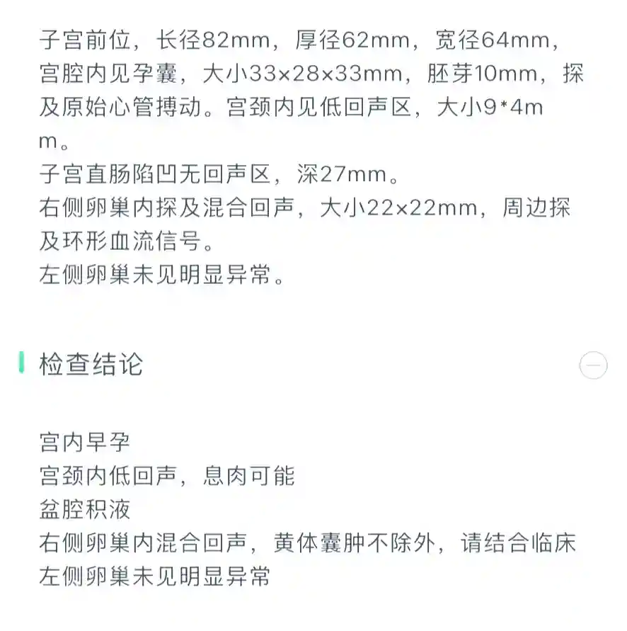 B超结果蛮好的,第一次见到胎芽,见图3。第一次听到“砰砰砰砰”,一秒n次的胎心,有点小激动。感觉小生命很顽强的。盆腔积液不算多,大夫内检说息肉上有血,但是还是无法排除宫内出血的概率,并让我继续吃保胎药,孕早期也没有什么可以做的。