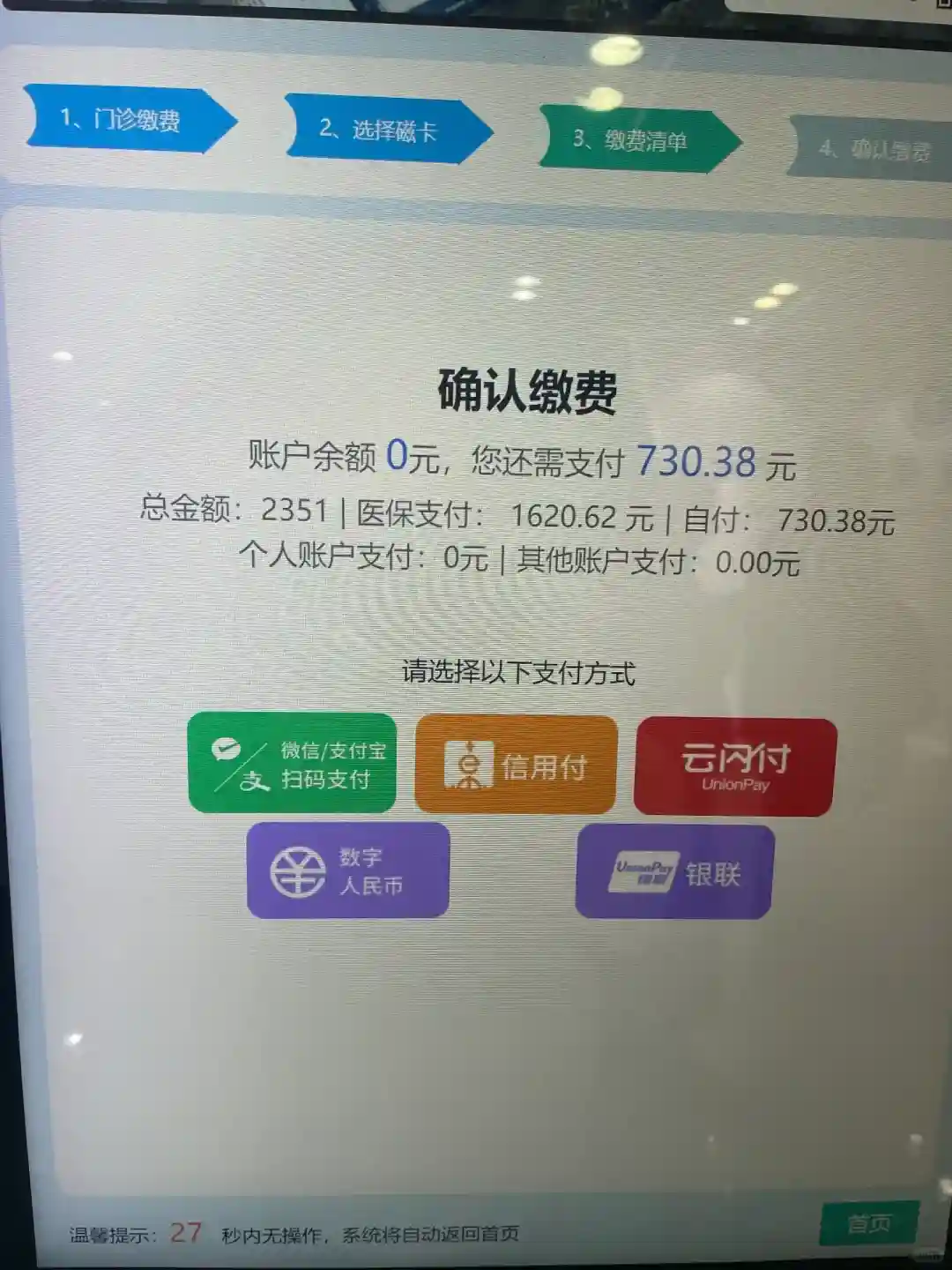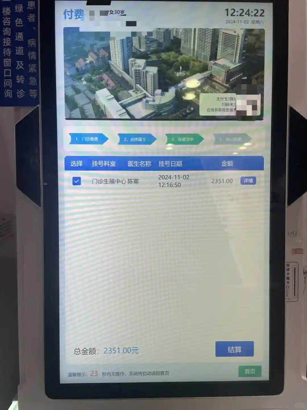 自助台缴费,医保前:男方¥1708,女方¥2351;