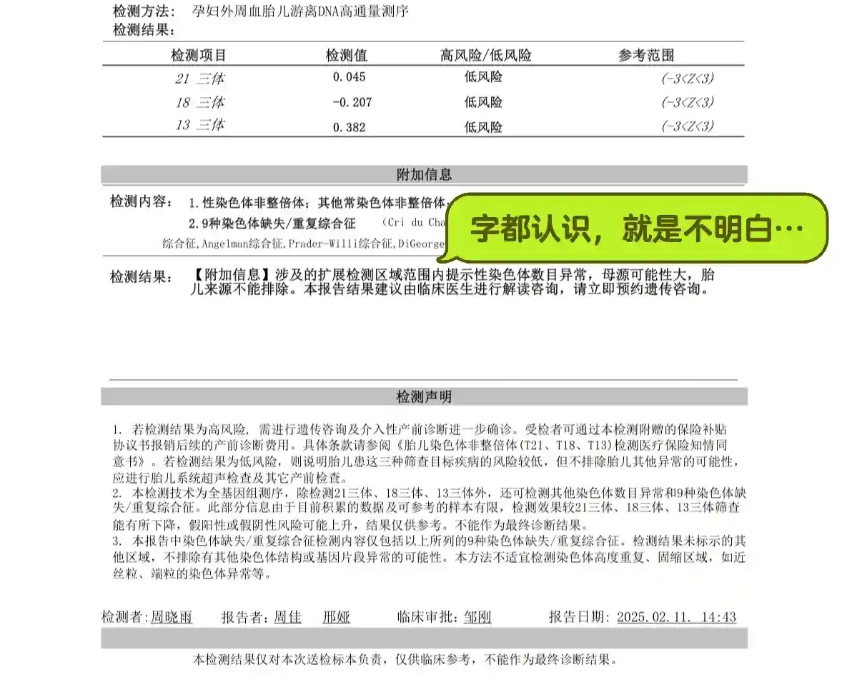 报告显示“母源可能性大”,表示即便结论正确,大概率是母亲本身染色体问题,而非胎儿染色体异常”加做我的基因检测(抽血),花费一千多。
