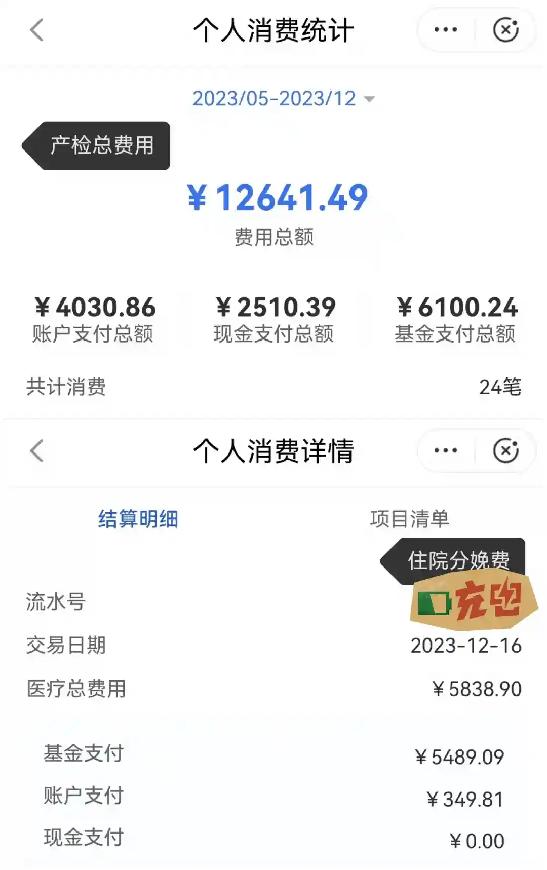2023年 二胎剖腹产双胞胎,分娩花费5838.90,报销5489.09,个人支付349.81,在泉州报销的。